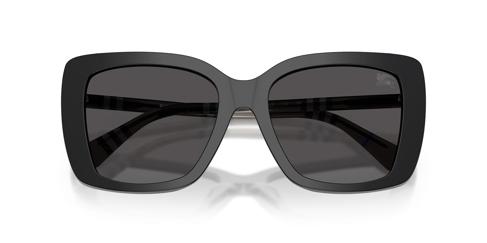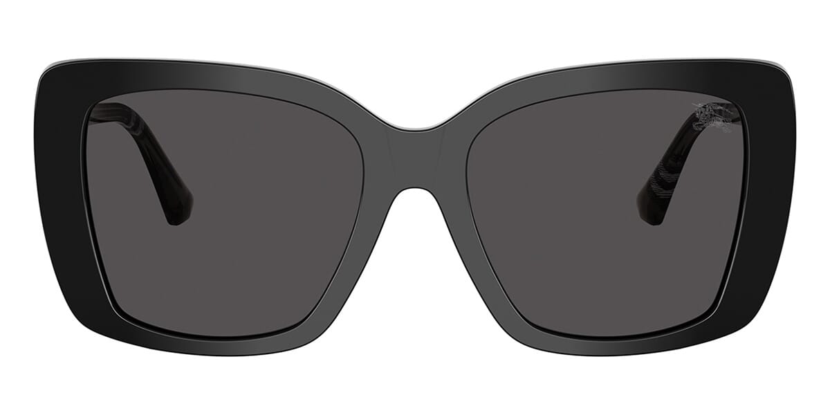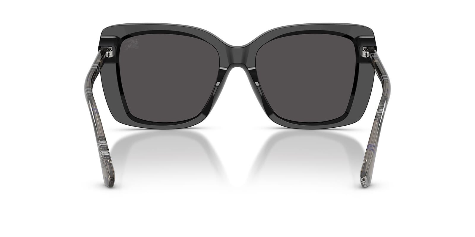 This square Burberry sunglass comes in a black frame with dark grey lenses.
