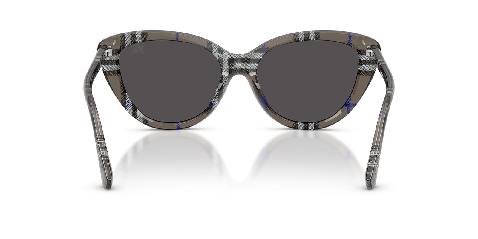 This cat eye Burberry sunglass comes in a check lichen frame with dark grey lenses.