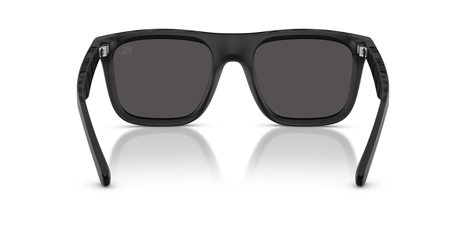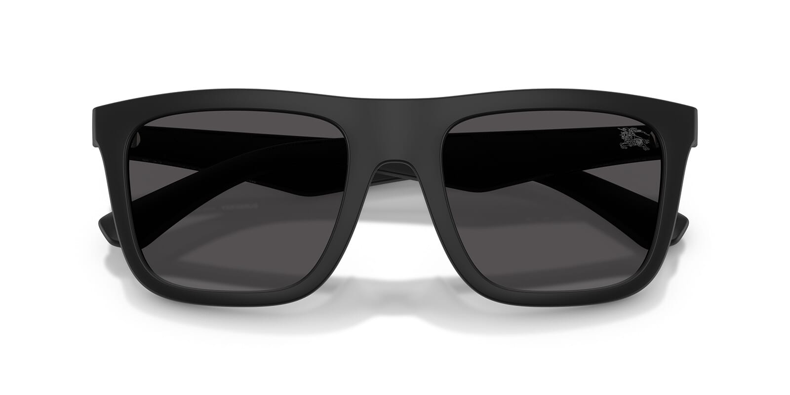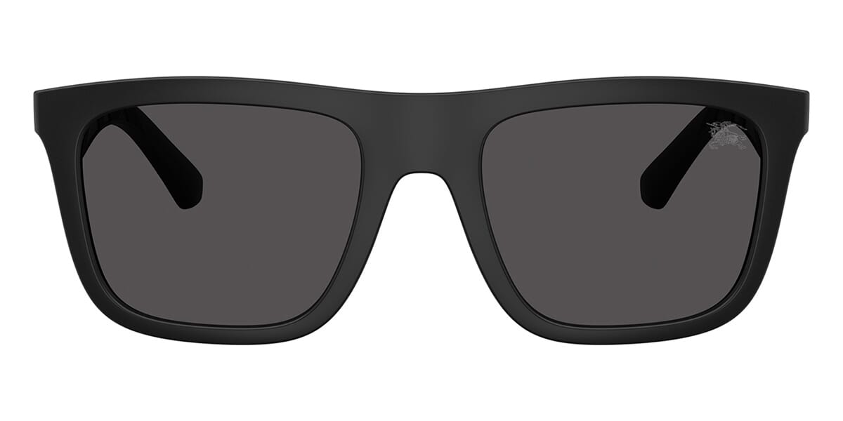 This square Burberry sunglass comes in a matte black frame with dark grey lenses.