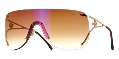 This shield Carrera sunglass comes in a gold with black frame with clear with red flash mirror lenses.