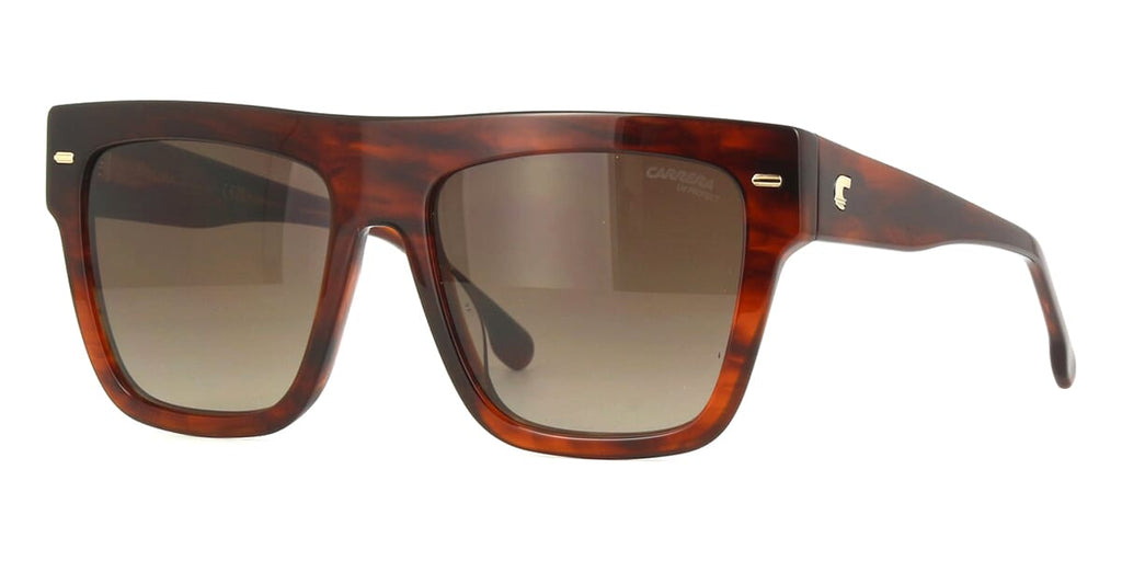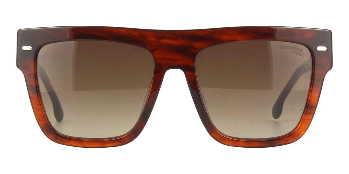 This square Carrera sunglass comes in a shiny brown havana frame with brown gradient lenses.