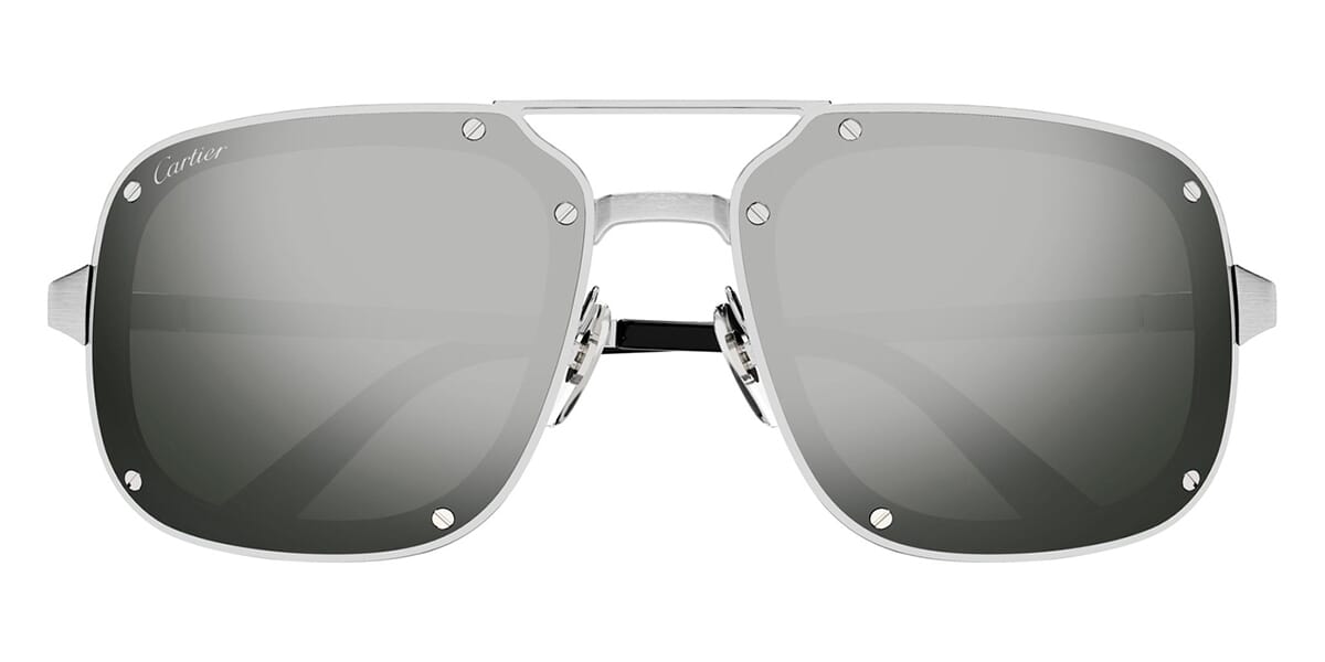 This square Cartier sunglass comes in a silver frame with grey with white flash mirror lenses.