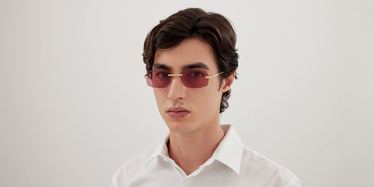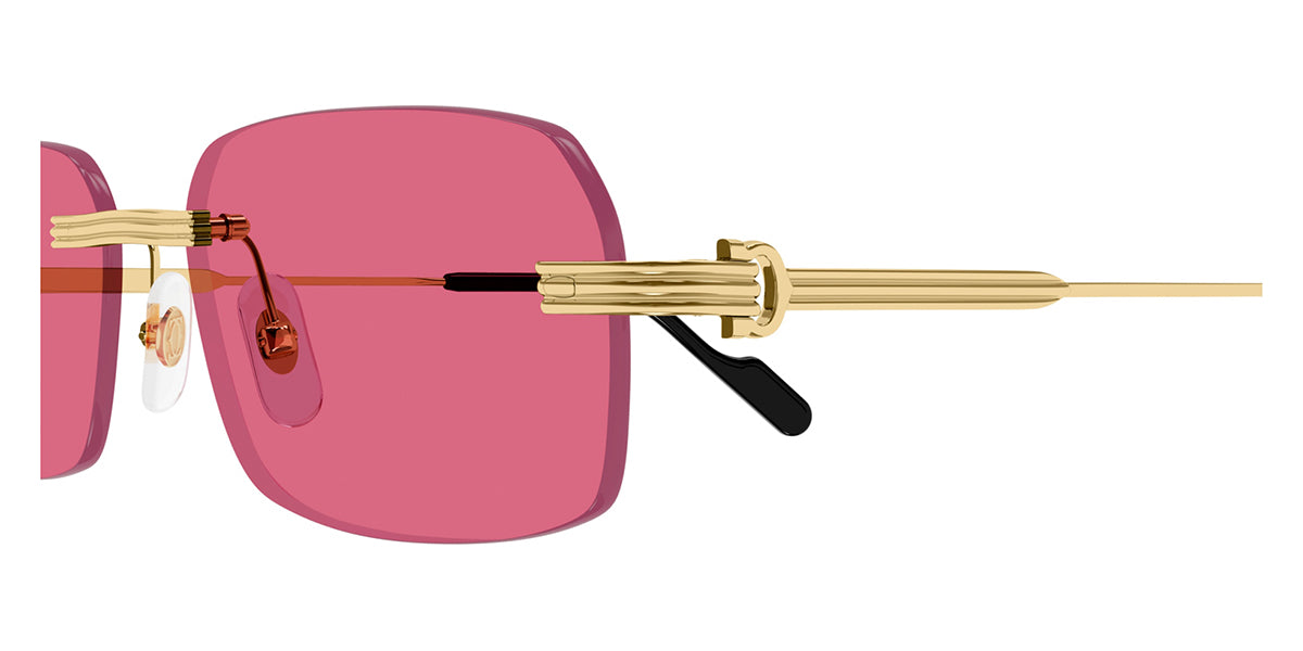 This square Cartier sunglass comes in a gold frame with pink lenses.