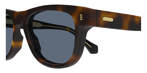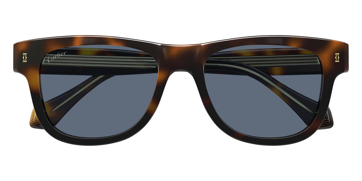 This square Cartier sunglass comes in a dark havana frame with blue lenses.