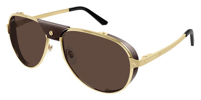 This aviator Cartier sunglass comes in a gold with black real leather bridge cover and side shields frame with grey polarised lenses.