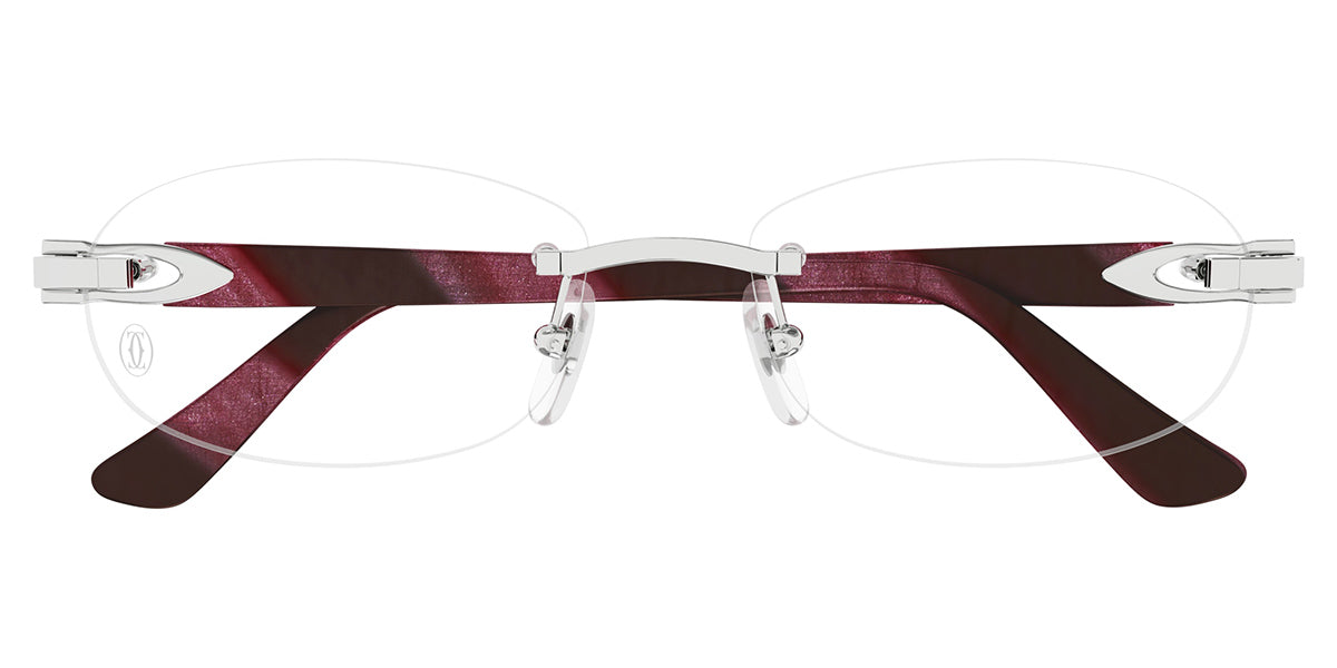 This round Cartier optical comes in a shiny silver and burgundy frame.