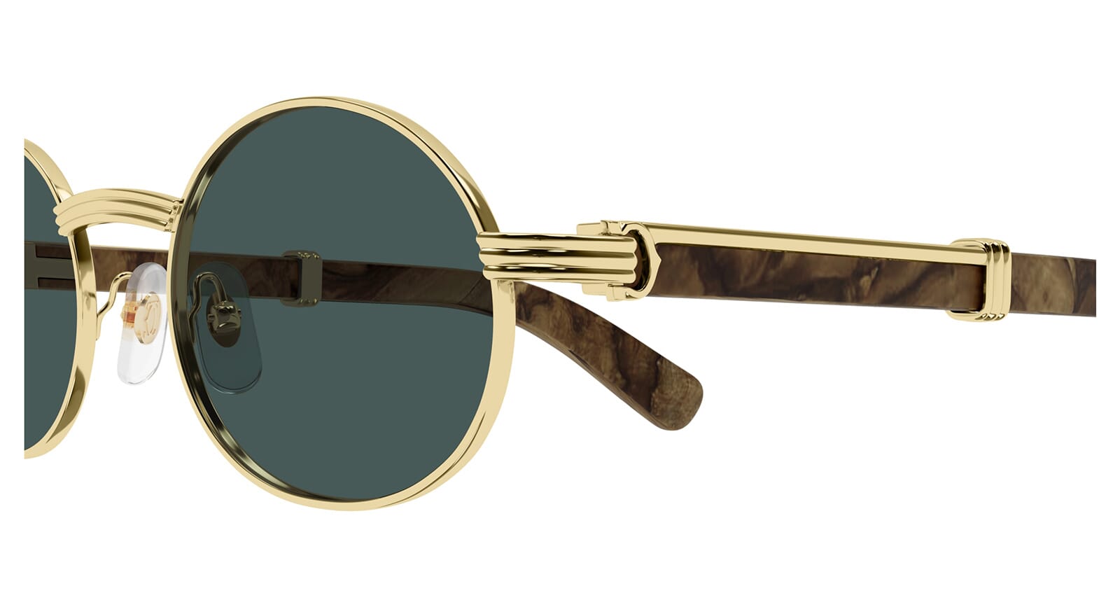 This square Cartier sunglass comes in a gold with brown frame with green lenses.