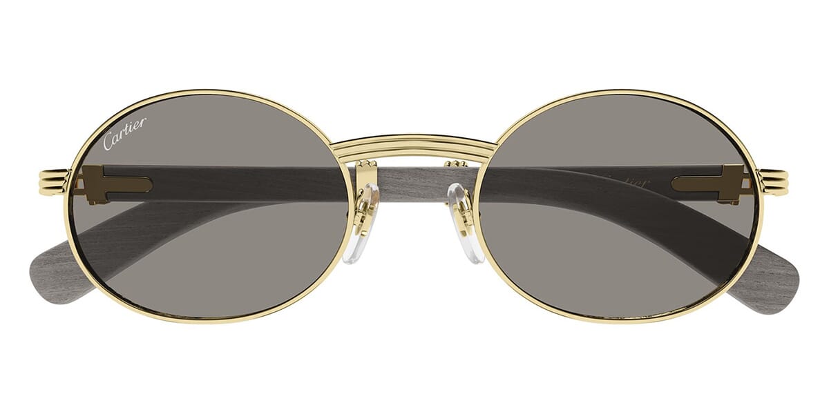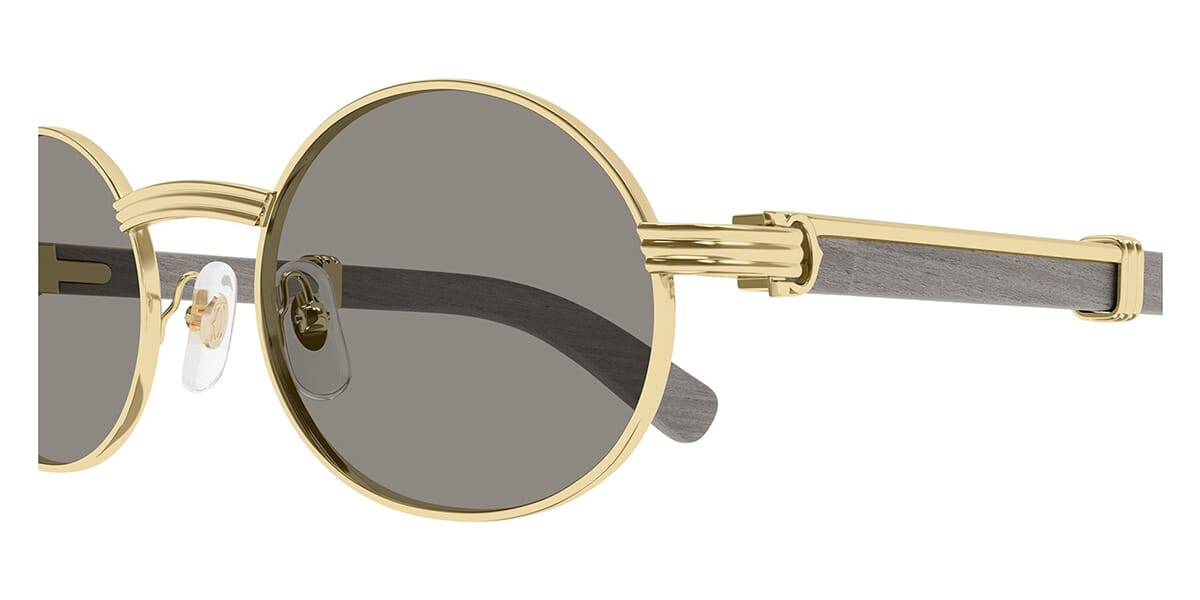 This round Cartier sunglass comes in a gold and grey real wood frame with grey lenses.