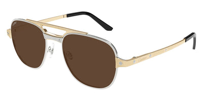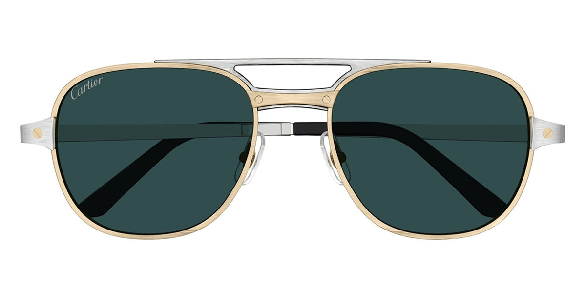 This aviator Cartier sunglass comes in a gold with silver frame with green lenses.