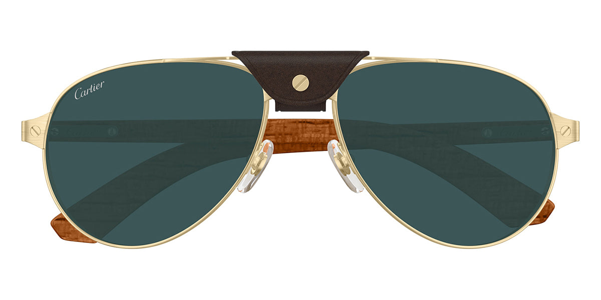 This aviator Cartier sunglass comes in a gold with brown wood frame with green lenses.