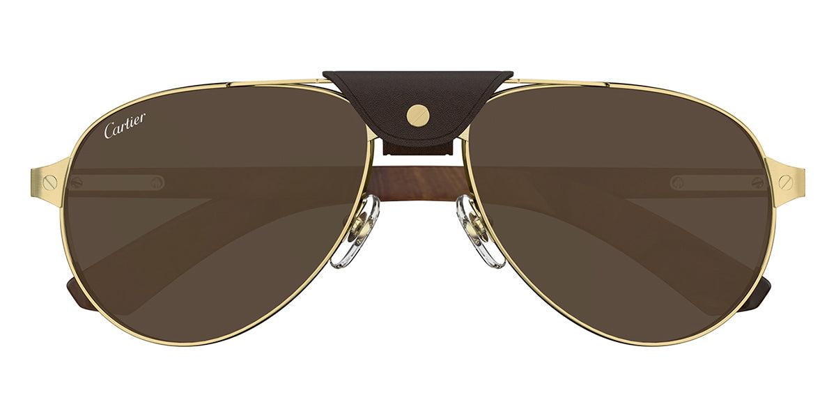 This aviator Cartier sunglass comes in a gold with dark brown wood frame with brown lenses.