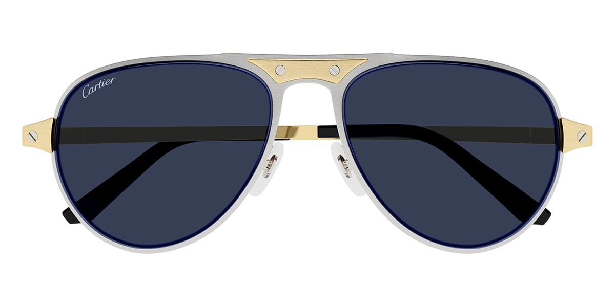 This aviator Cartier sunglass comes in a brushed silver with gold frame with blue lenses.