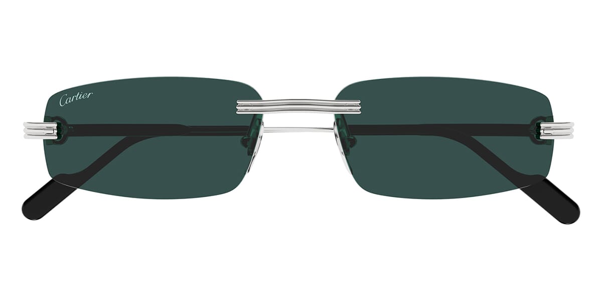 This square Cartier sunglass comes in a silver frame with green lenses.