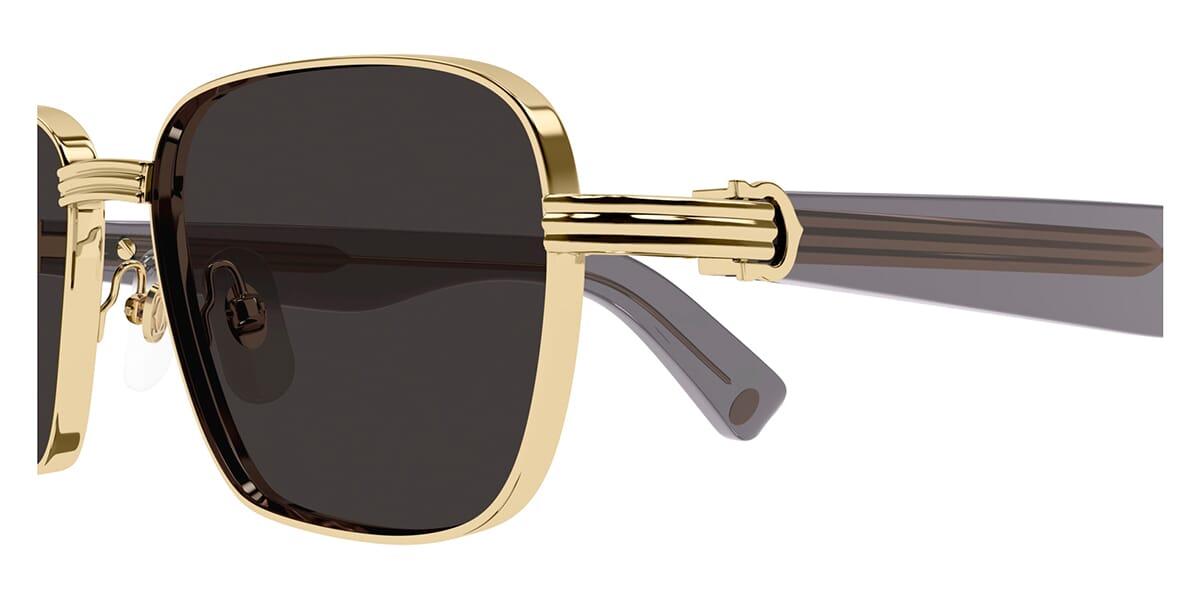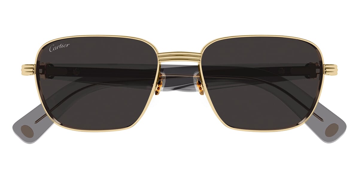 This square Cartier sunglass comes in a shiny gold and grey crystal frame with grey with light mirror lenses.