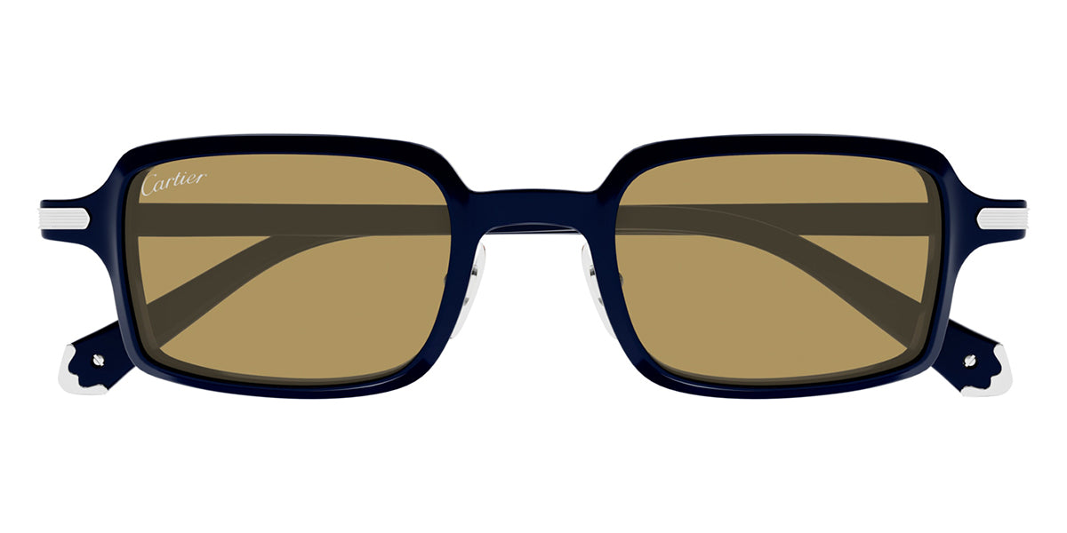 This square Cartier sunglass comes in a blue frame with khaki brown lenses.