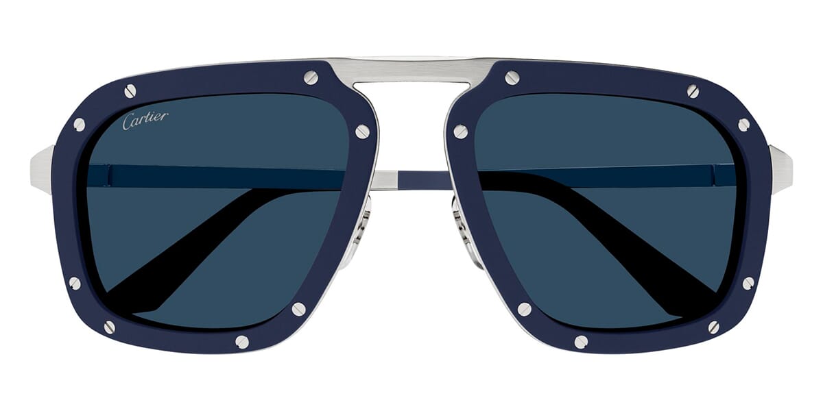 This square Cartier sunglass comes in a matte blue on silver frame with blue with light mirror polarised lenses.