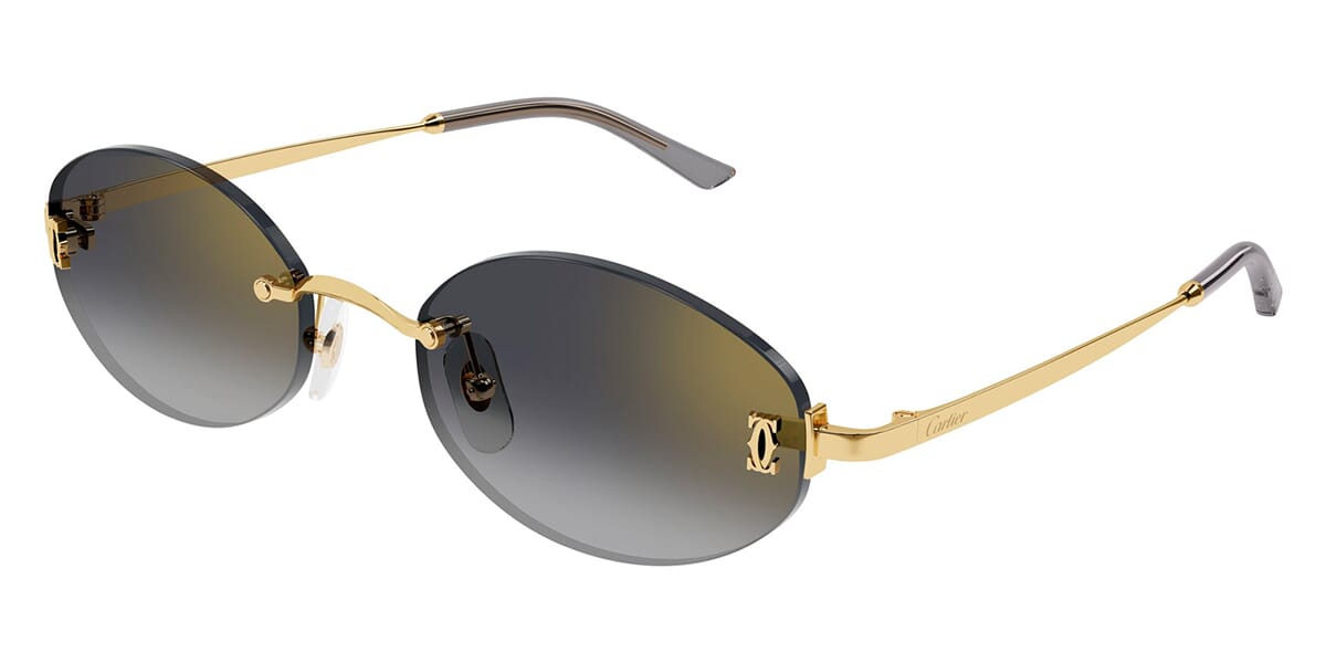 This round Cartier sunglass comes in a shiny gold frame with grey gradient with bronze lenses.