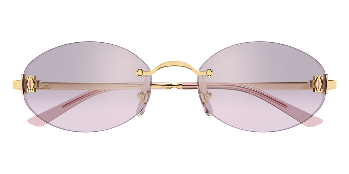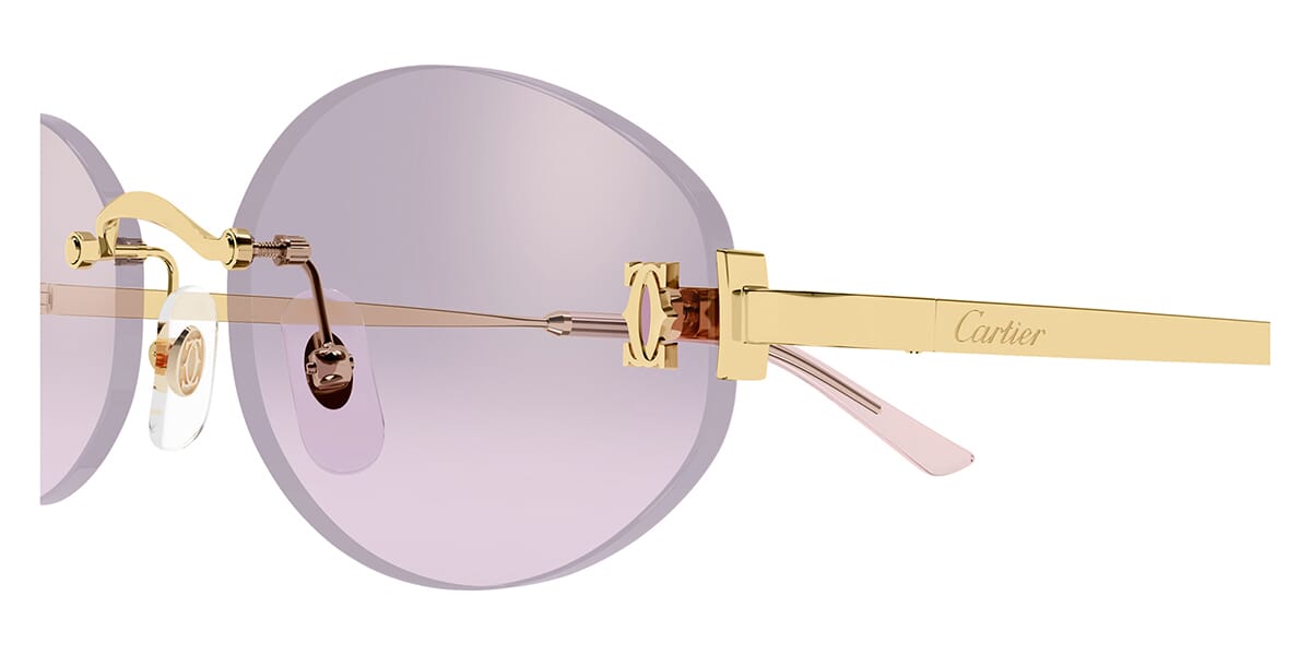 This round Cartier sunglass comes in a gold frame with pink lenses.