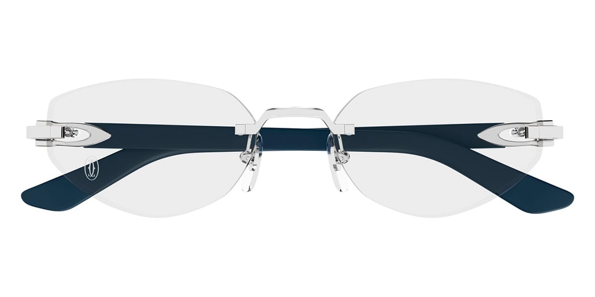 This cat eye Cartier optical comes in a shiny silver and blue frame.