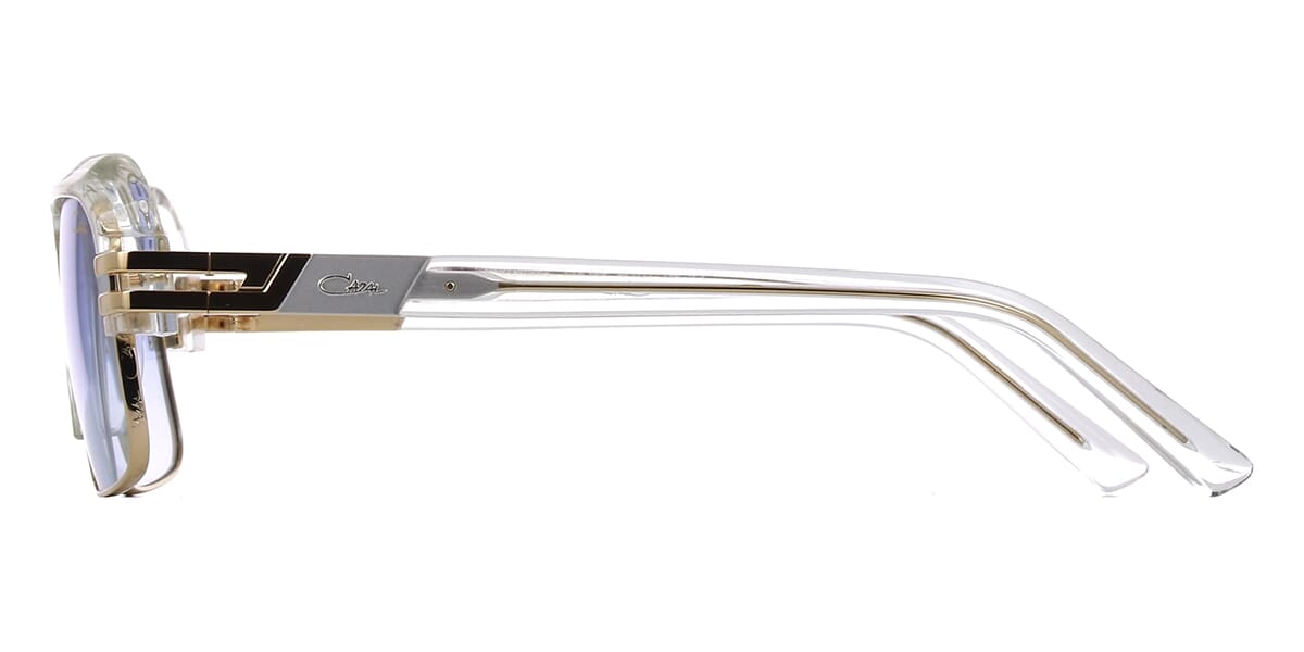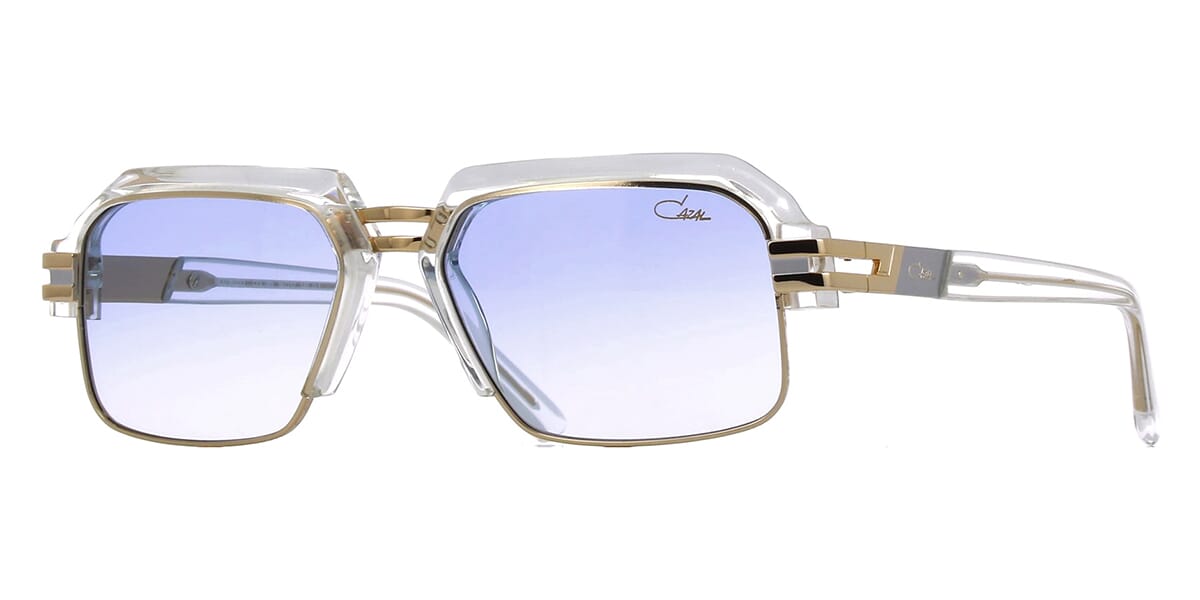 This square Cazal sunglass comes in a crystal clear and gold frame with blue to clear gradient lenses.