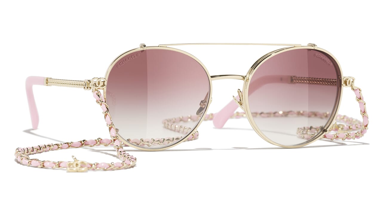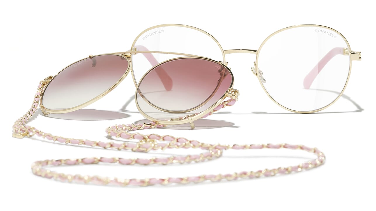 Pale Gold frame. Gradient Fuchsia (clip on) with Clear blue-violet light filter lenses.