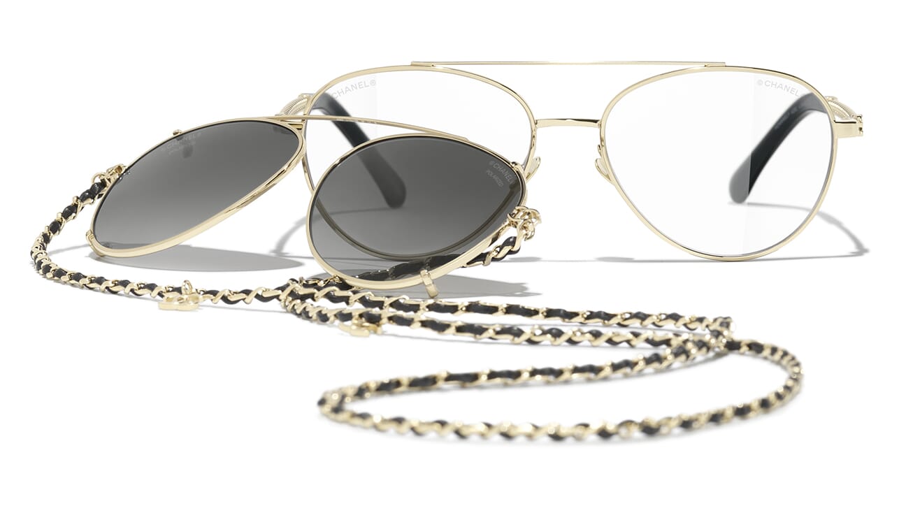Pale Gold frame. Gradient Grey Polarised (clip on) with Clear blue-violet light filter lenses.