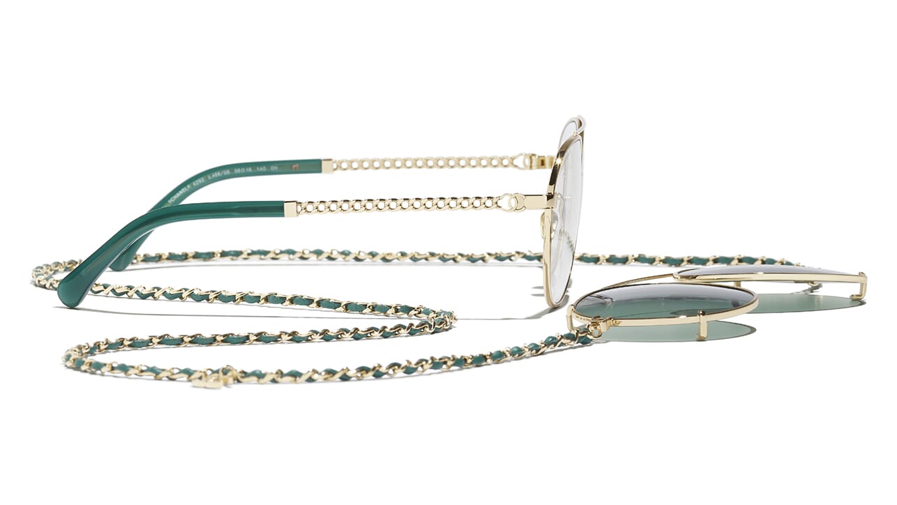 Pale Gold frame. Solid Green (clip on) with Clear blue-violet light filter lenses.