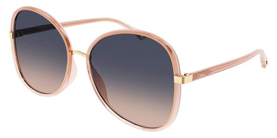 Grey butterfly frames, introduced in Chloe's Spring/Summer 2021 collection. These are part of the Franky collection, a retro-driven new concept evoking 70's style. Frames from the Franky collection come in a kaleidoscope of rainbow colour, inspired by the oversized flair - and flares - of 70's fashion. Grey gradient lenses are surrounded by transparent grey frames, allowing the yellow gold tones of the metal skeleton to show through. Accented with yellow gold-plated temple detailing and nose-bridge, the classically elegant Chloe logo is featured in gold lettering on the left temple, while both temple tips feature the signature teardrop cut-out, providing both aesthetic appeal, and the option to attach Chloe eyewear jewellery.