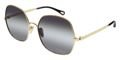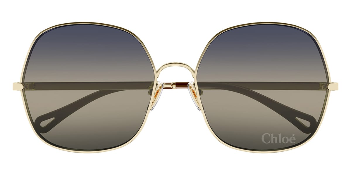 This square Chloe sunglass comes in a shiny classic gold frame with blue lenses.