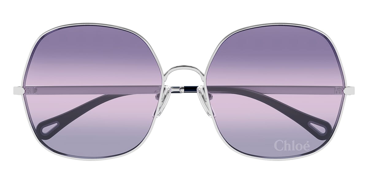 This square Chloe sunglass comes in a shiny silver frame with violet lenses.