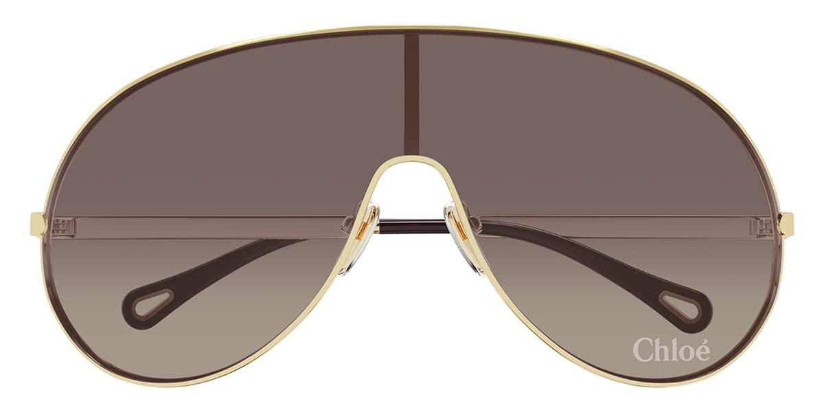 This shield Chloe sunglass comes in a shiny classic gold frame with brown lenses.