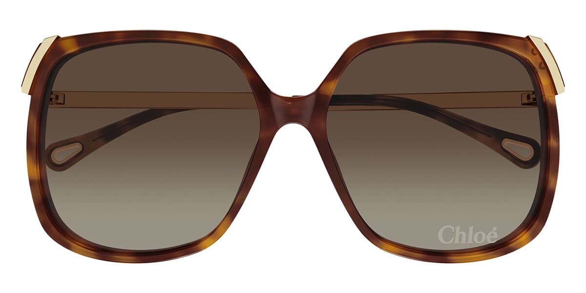 This square Chloe sunglass comes in a havana with gold frame with brown lenses.