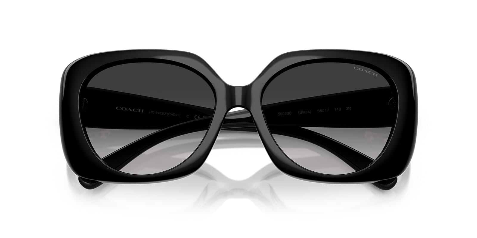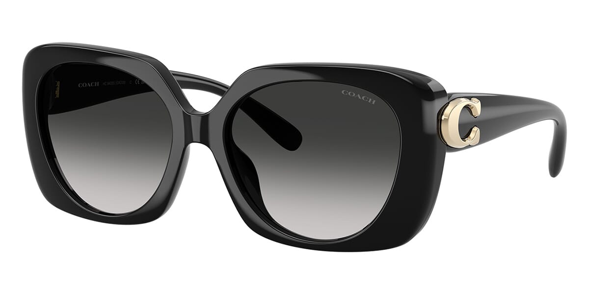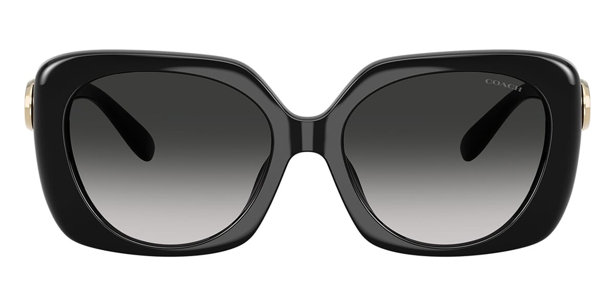 This square Coach sunglass comes in a black frame with grey gradient lenses.