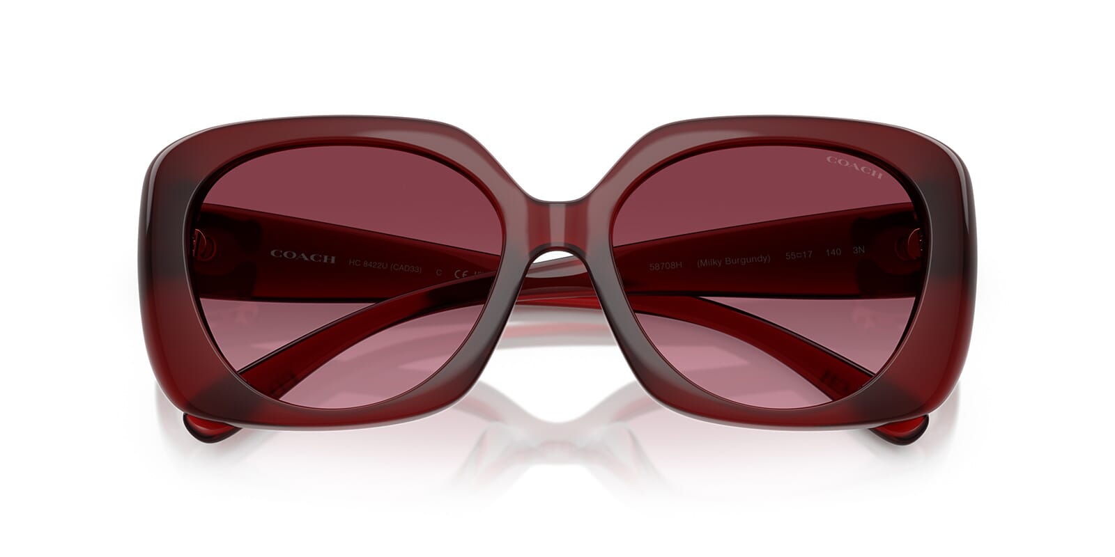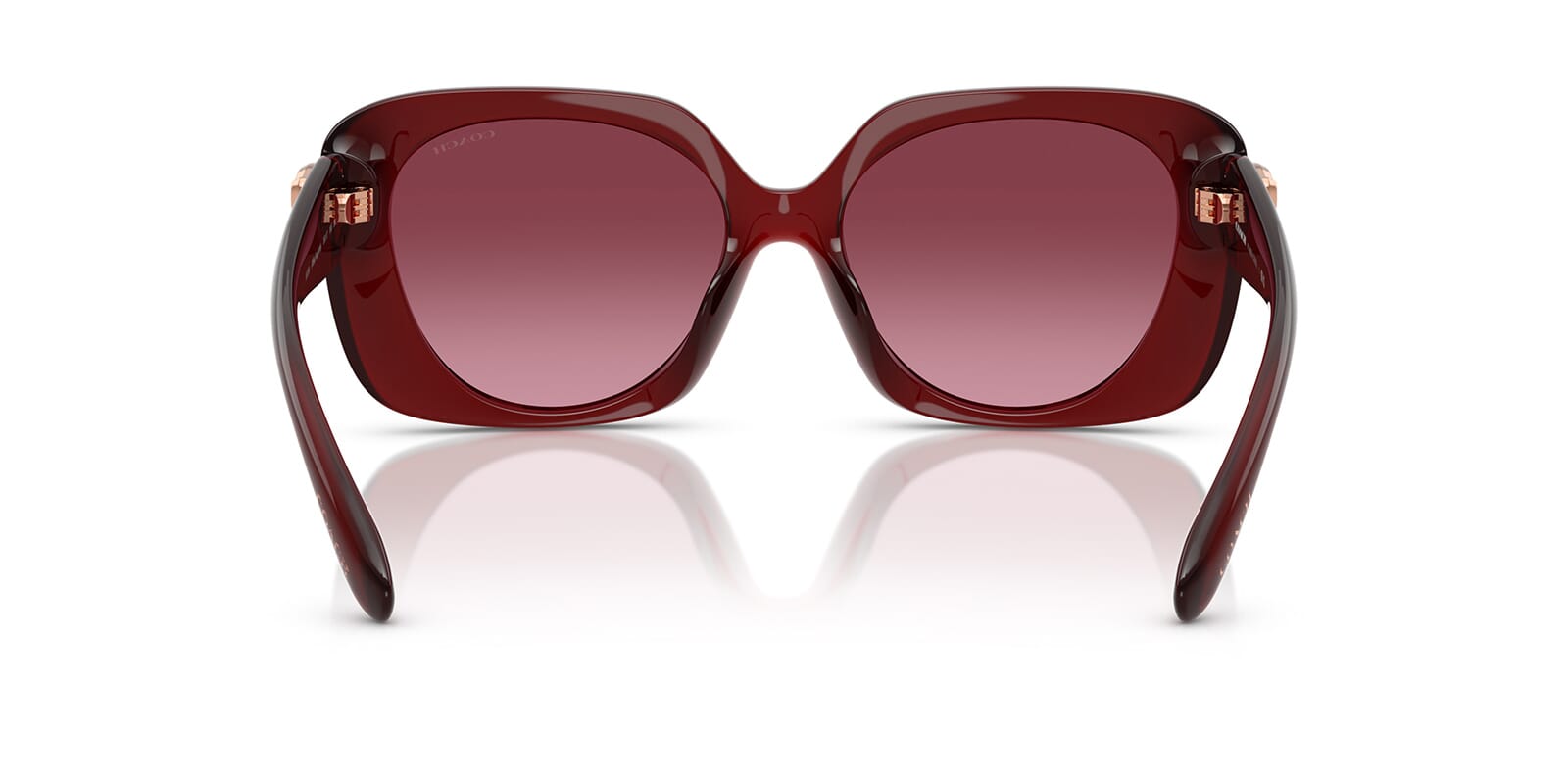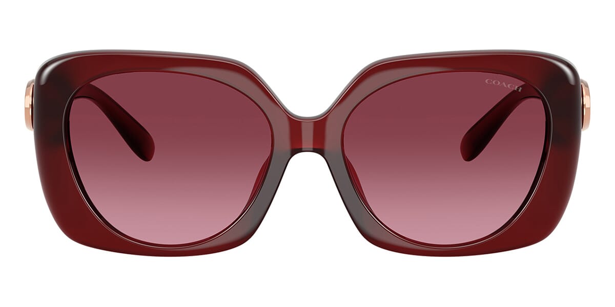 This square Coach sunglass comes in a milky burgundy frame with burgundy gradient lenses.