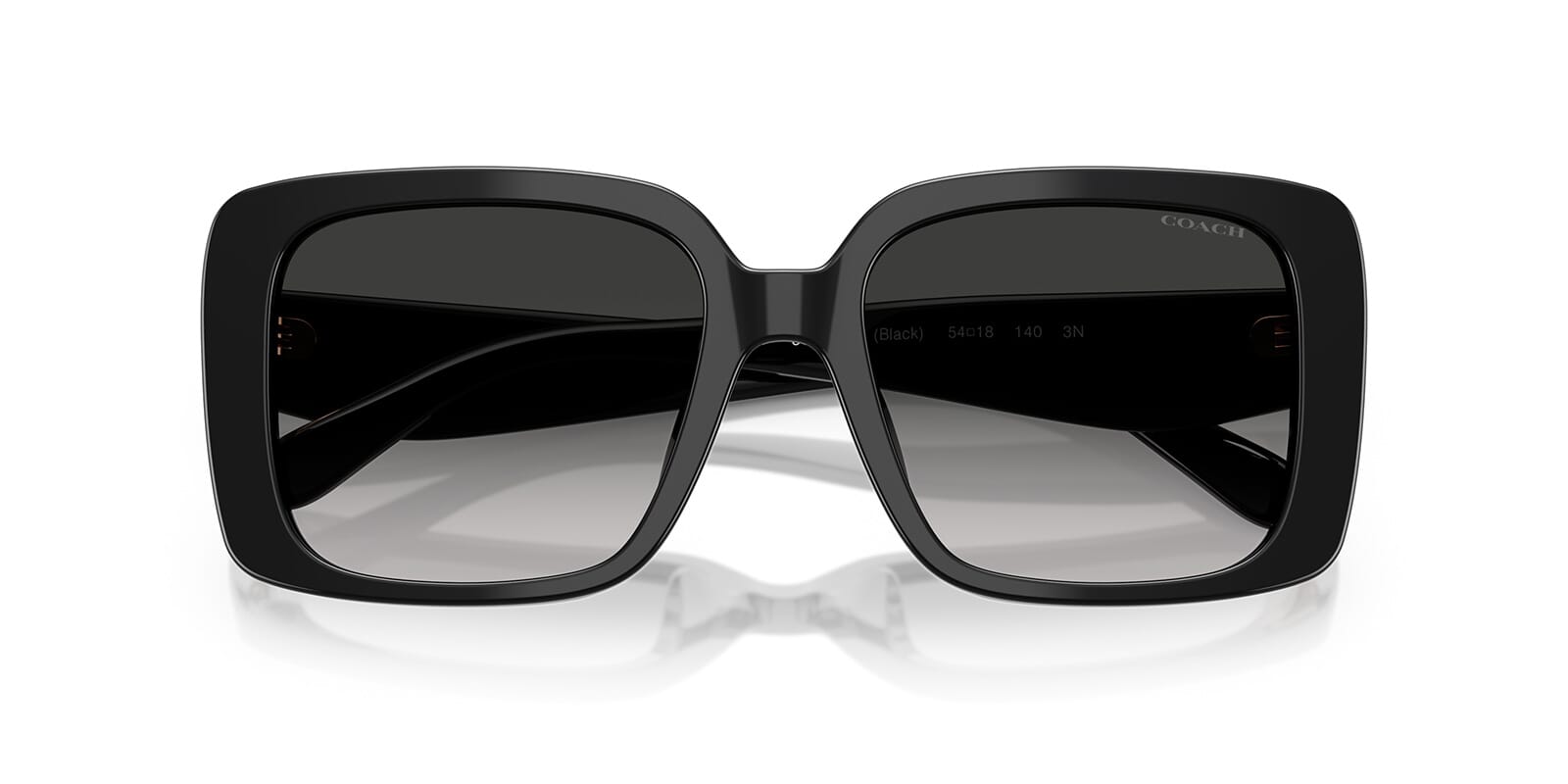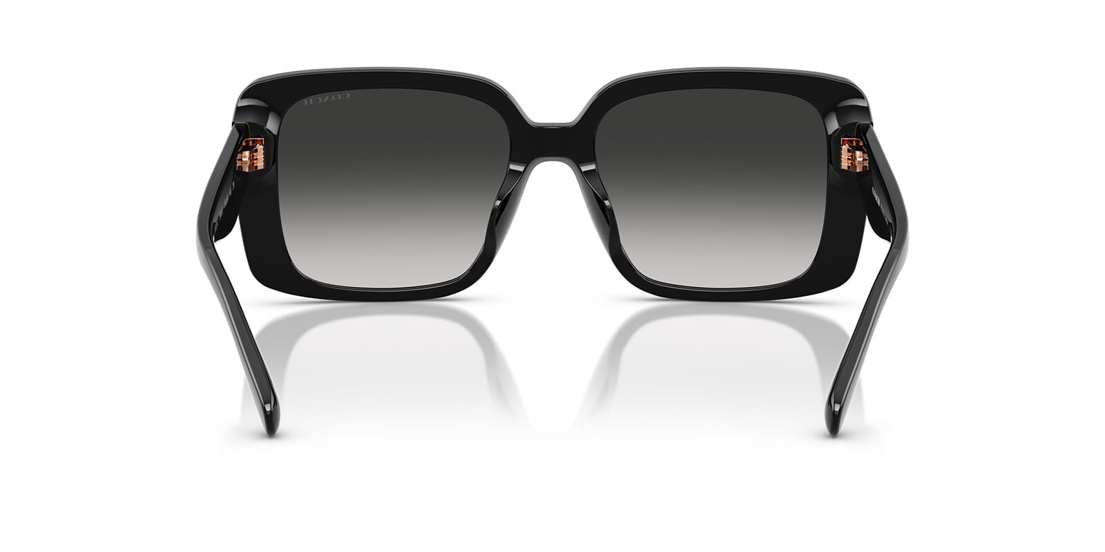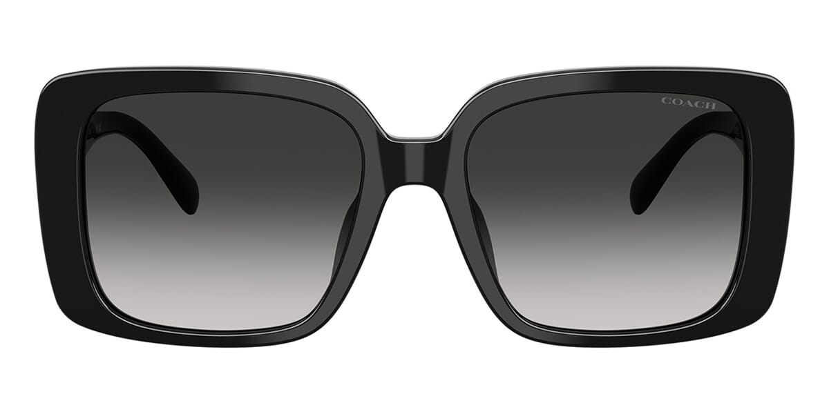 This square Coach sunglass comes in a black frame with grey gradient lenses.