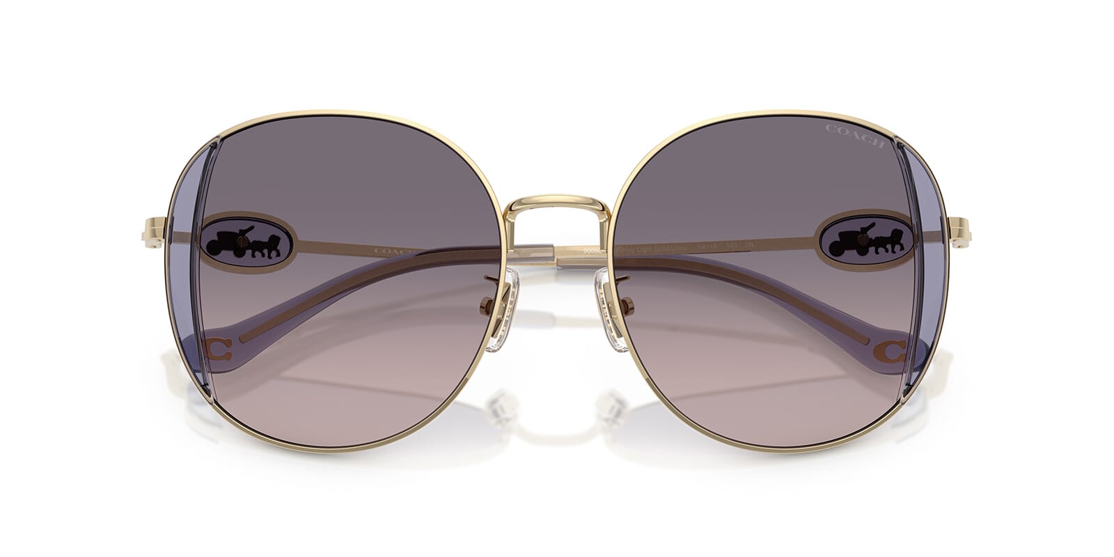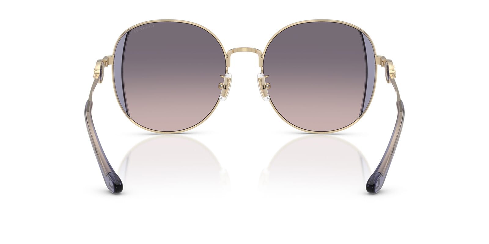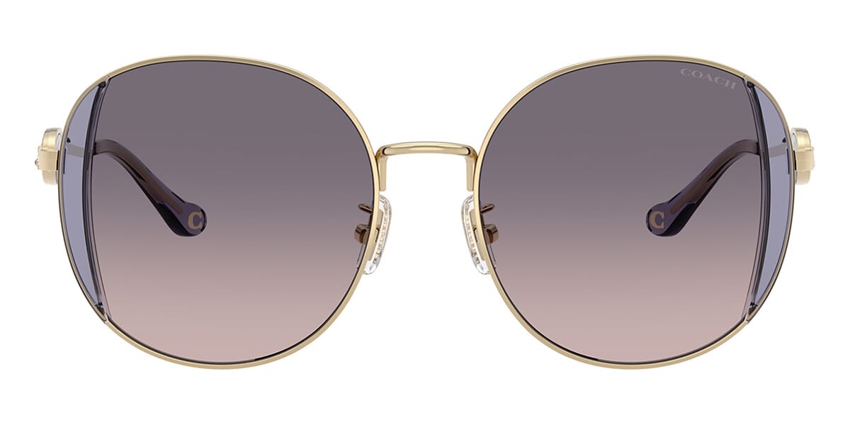 This round Coach sunglass comes in a shiny light gold frame with lilac peach gradient lenses.