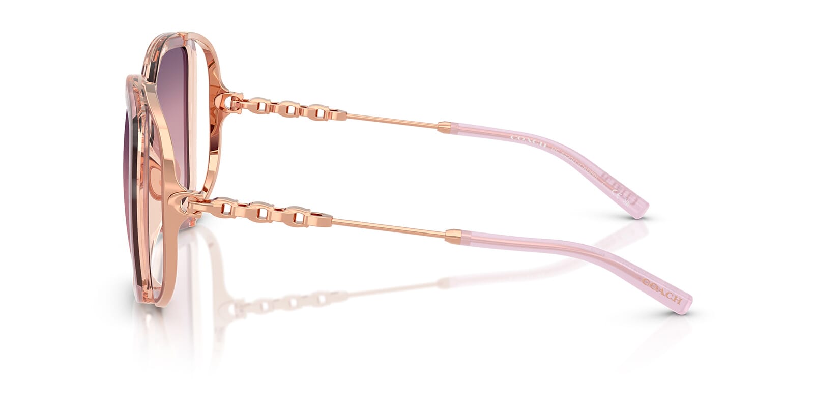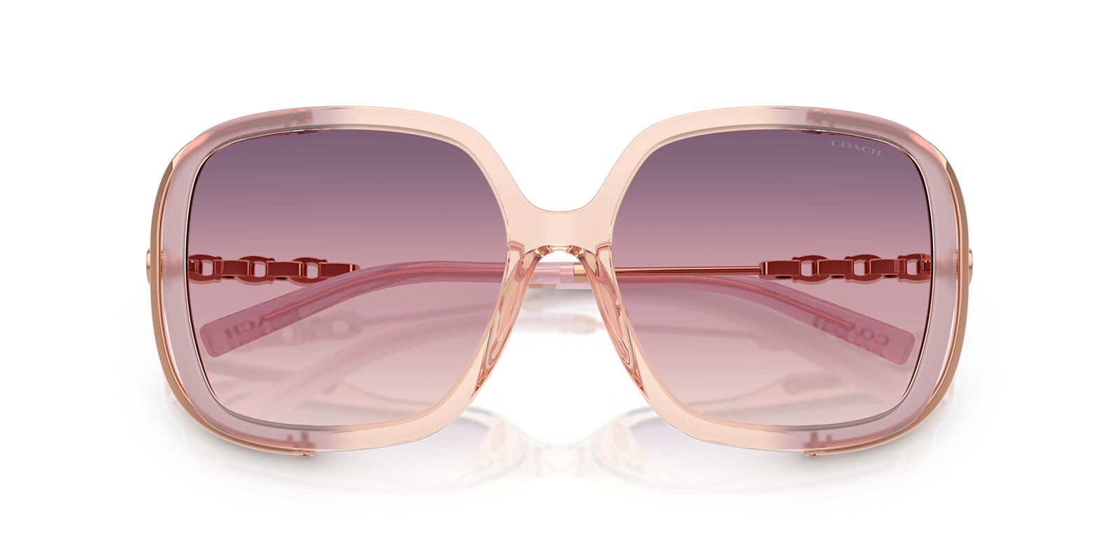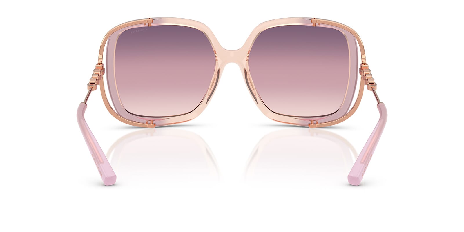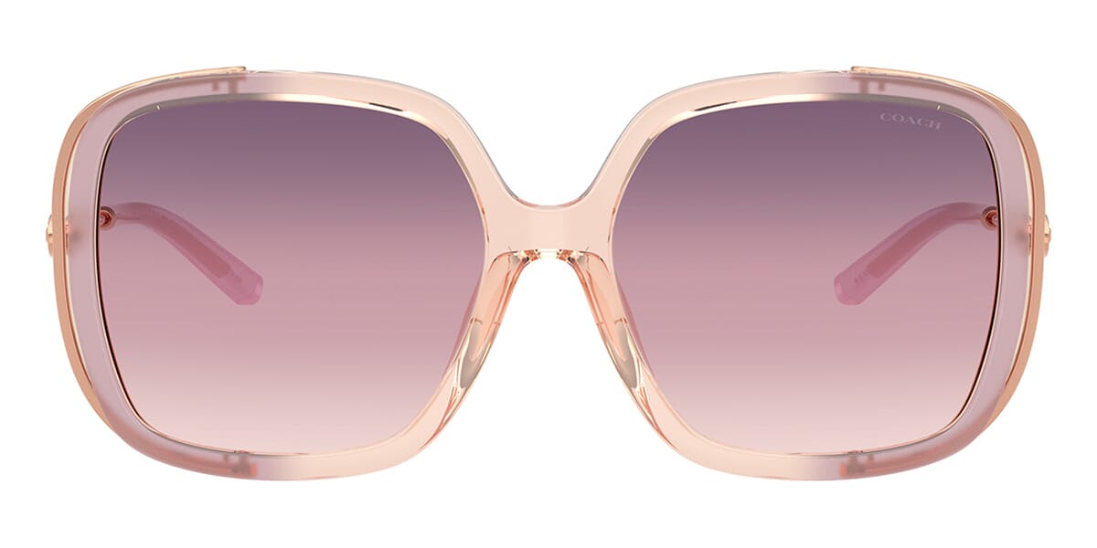 This square Coach sunglass comes in a lilac and peach gradient frame with purple yellow gradient lenses.