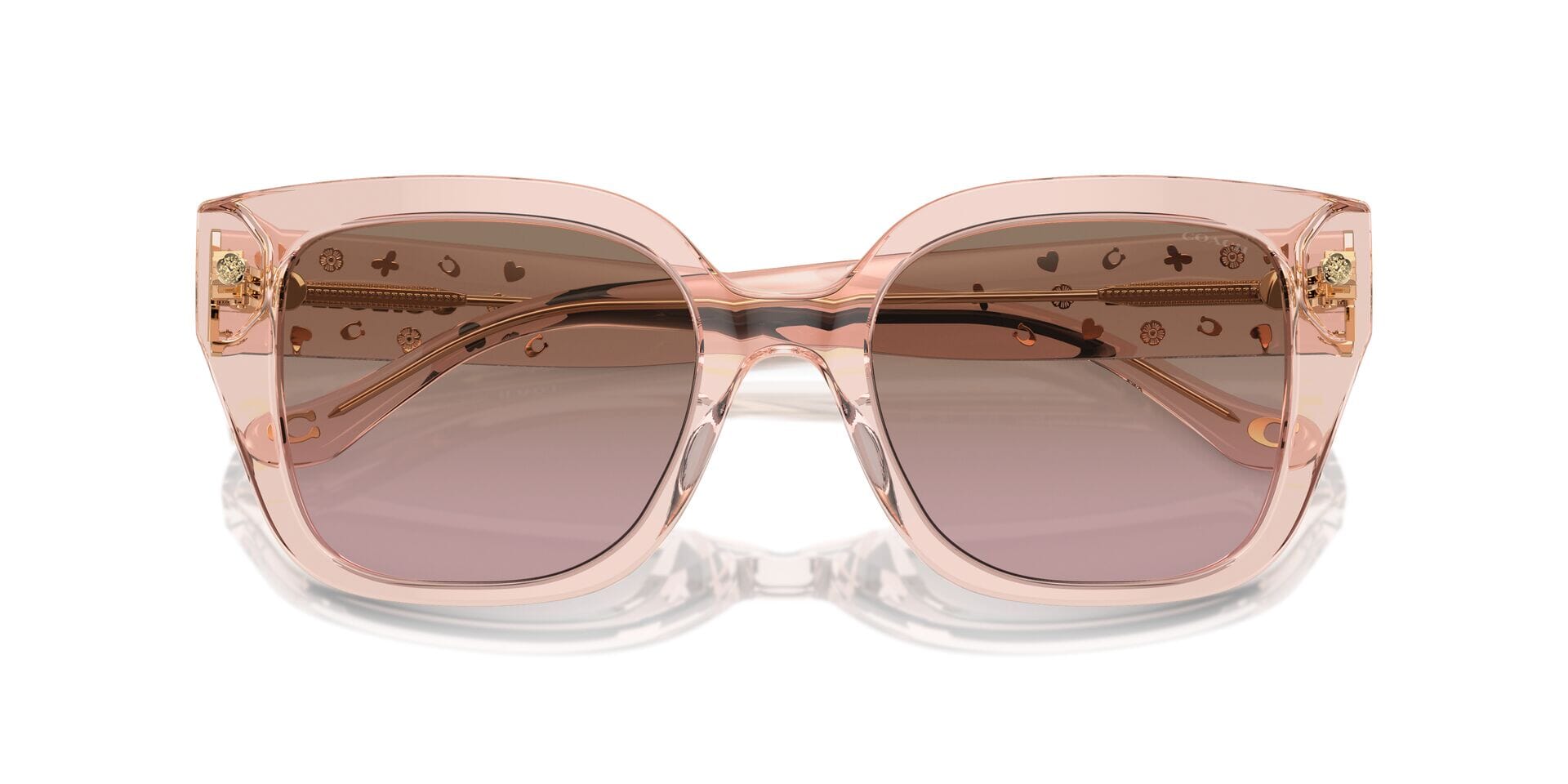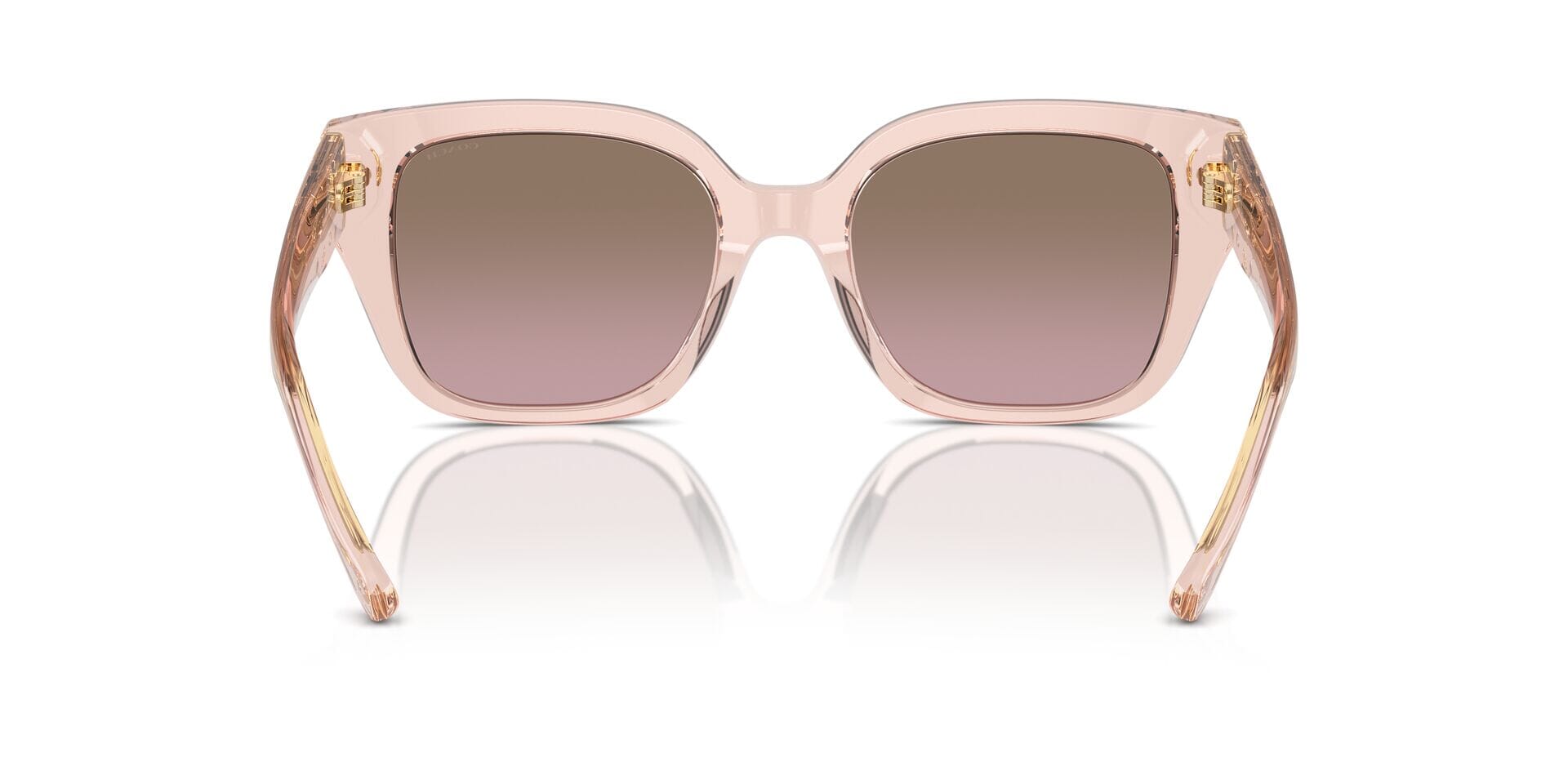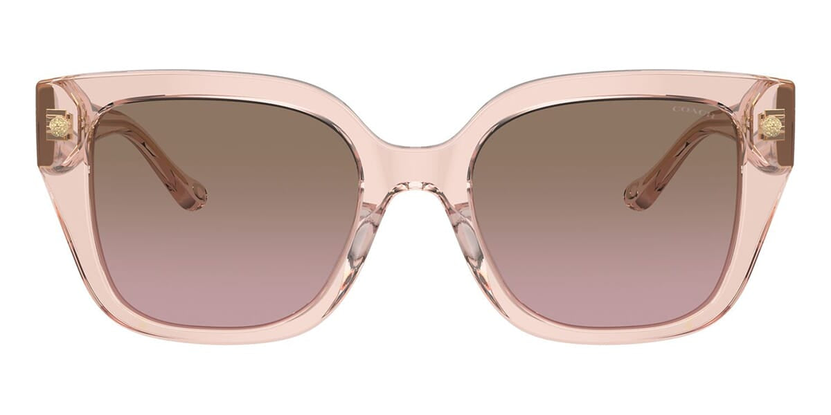 This square Coach sunglass comes in a dusty rose crystal frame with brown to pink gradient lenses.