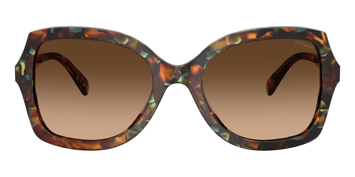 This butterfly Coach sunglass comes in a jade pearl tortoise frame with brown gradient lenses.