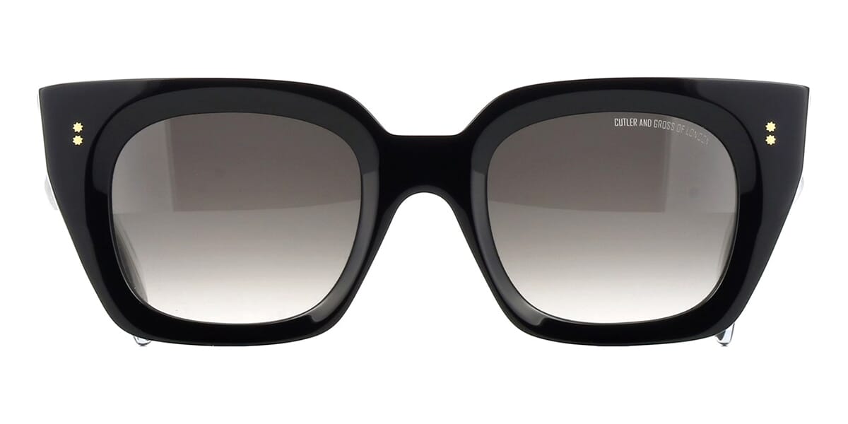 This square Cutler and Gross sunglass comes in a shiny black frame with grey gradient with light mirror lenses.