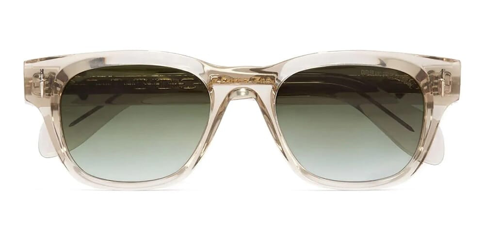 This square Cutler and Gross sunglass comes in a crystal nude brown frame with green to clear gradient lenses.