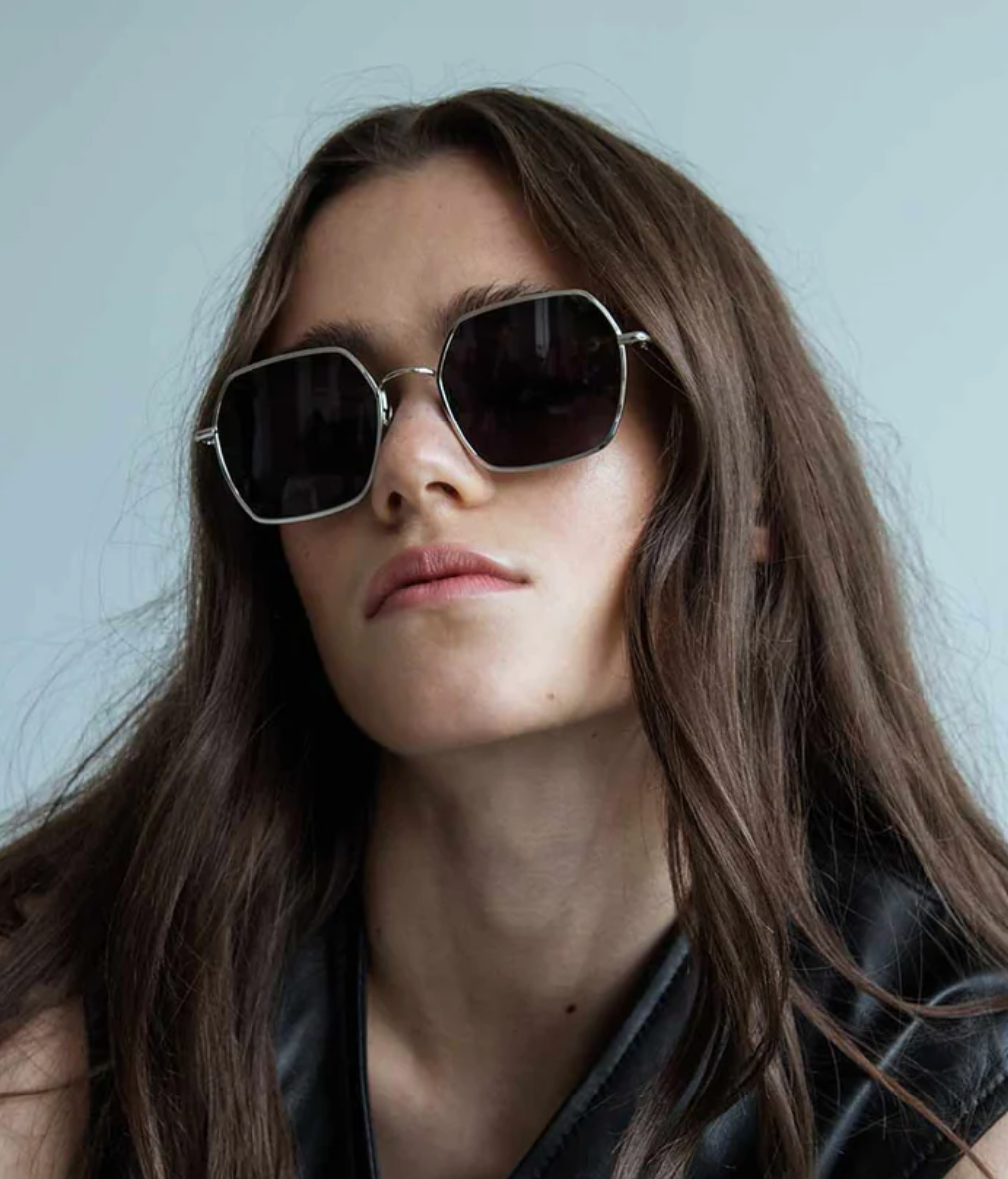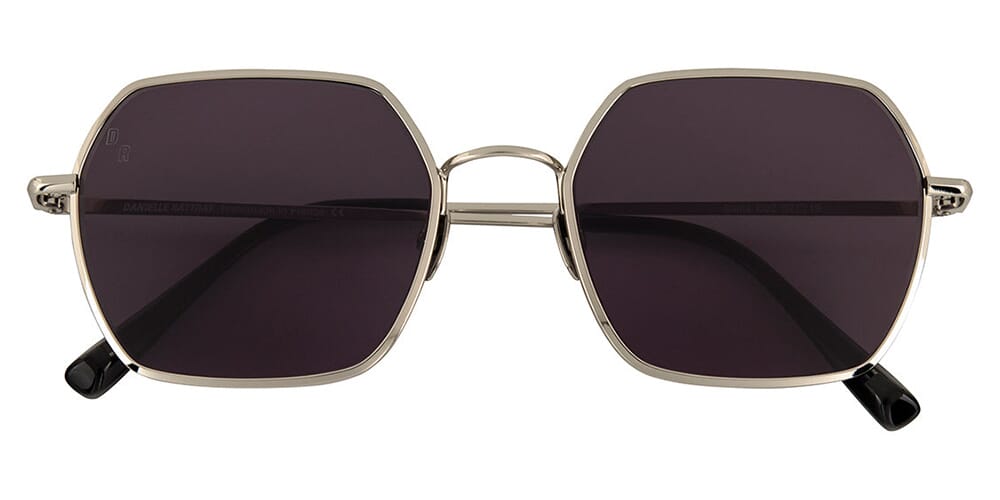 This square Danielle Rattray sunglass comes in a silver frame with grey lenses.