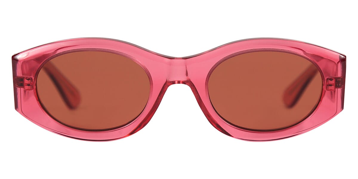 This square Danielle Rattray sunglass comes in a crystal magenta frame with cherry polar red lenses.
