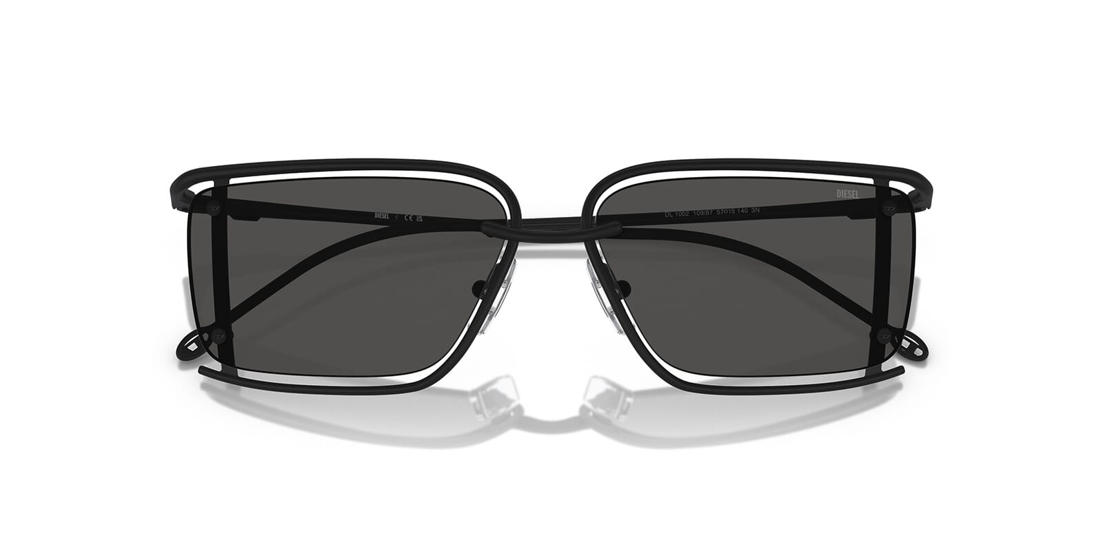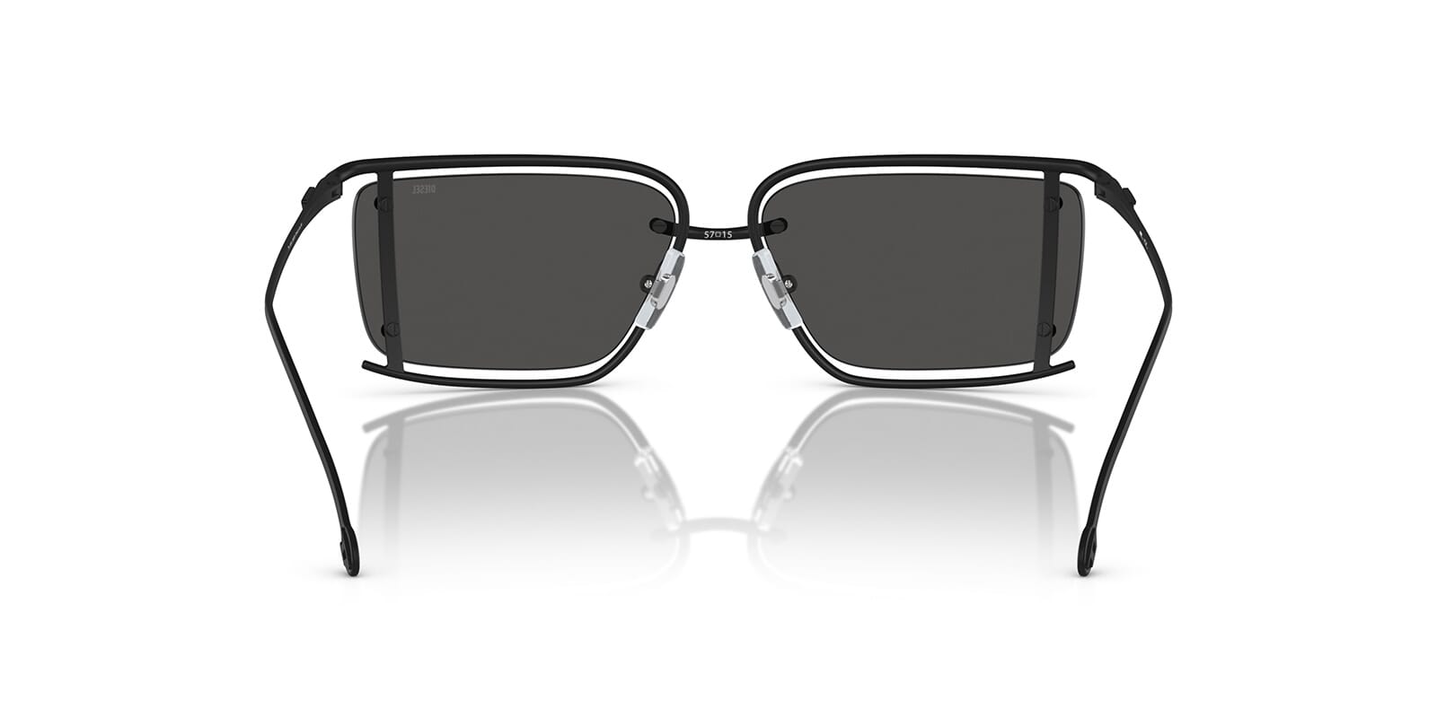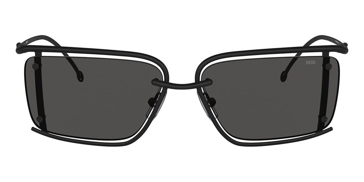 This rectangular Diesel sunglass comes in a matte black frame with dark grey lenses.