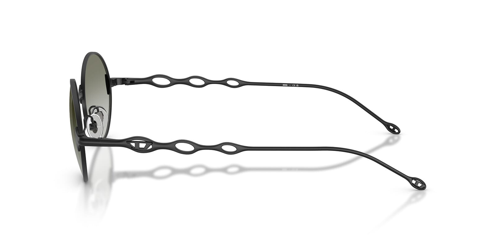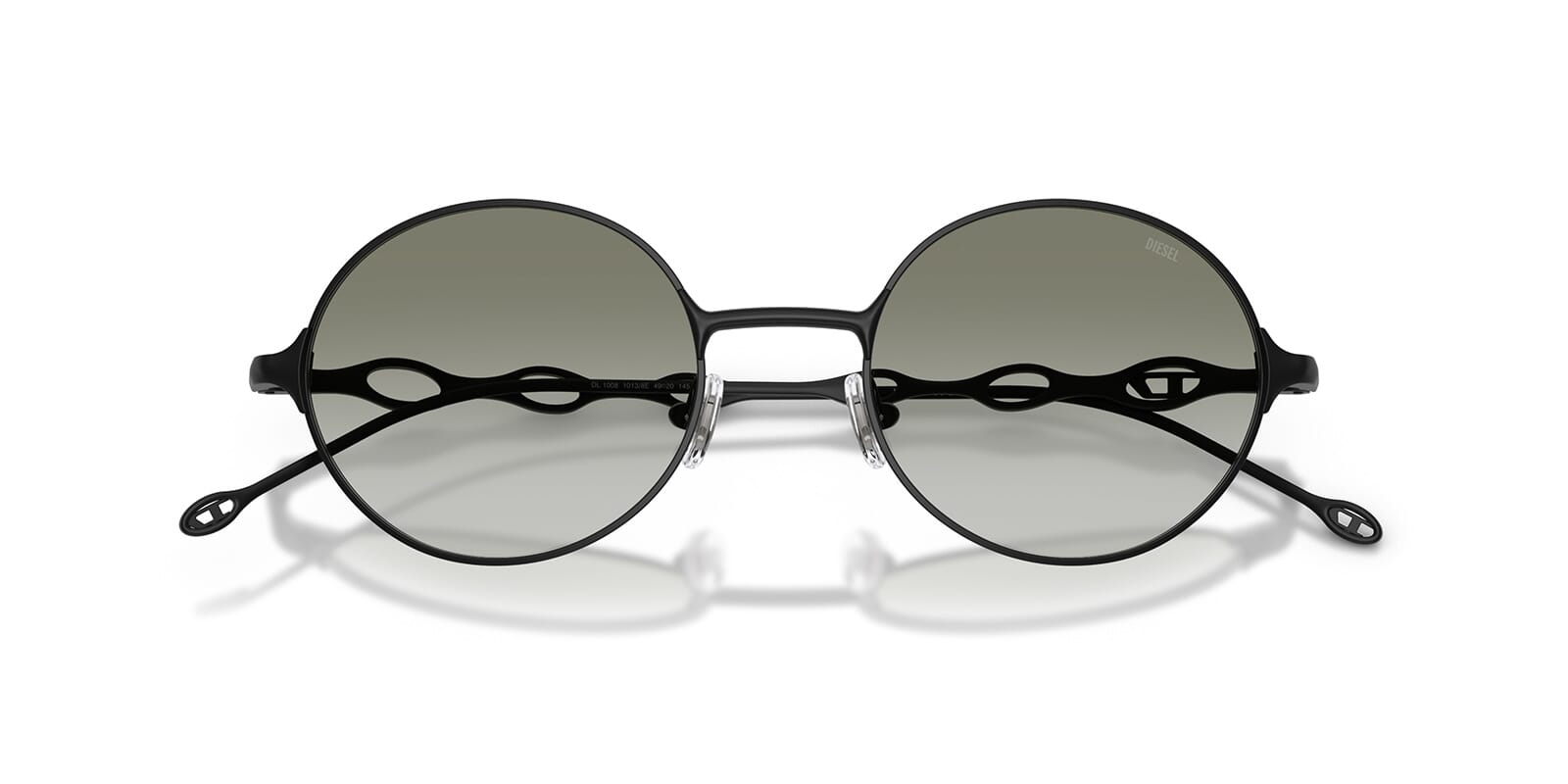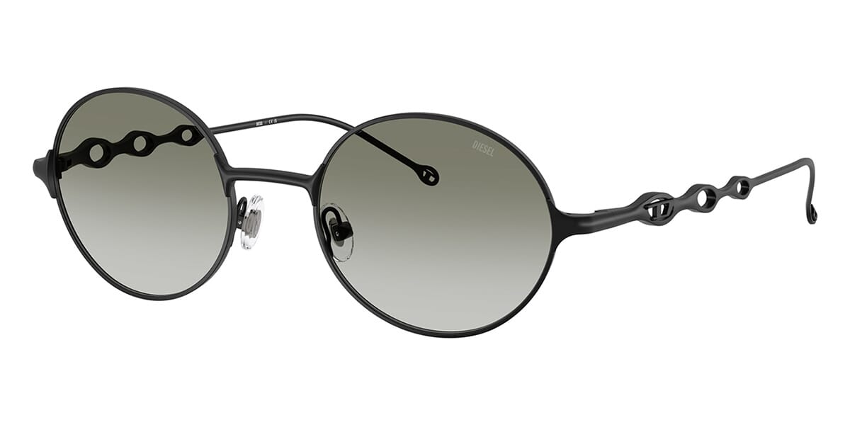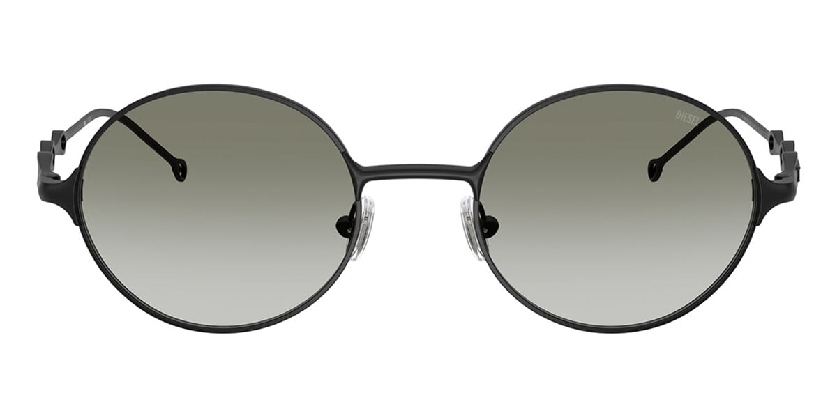 This round Diesel sunglass comes in a powder matte black frame with light green gradient lenses.