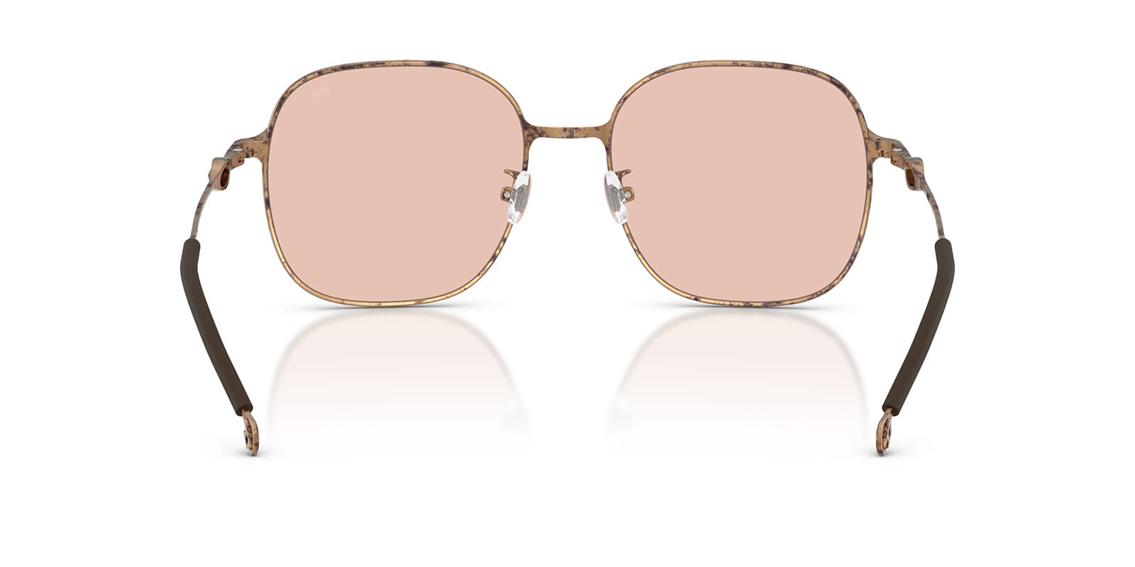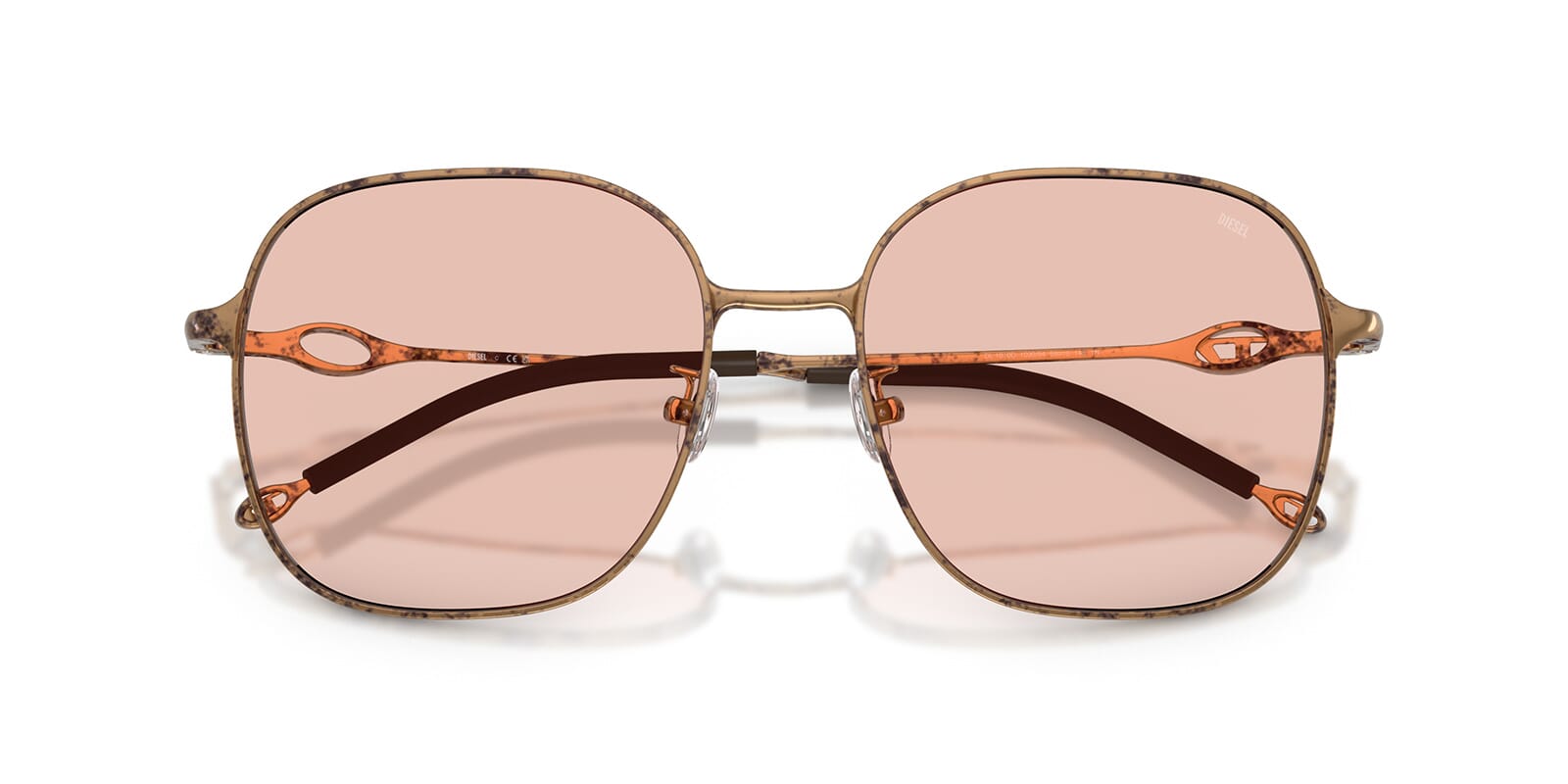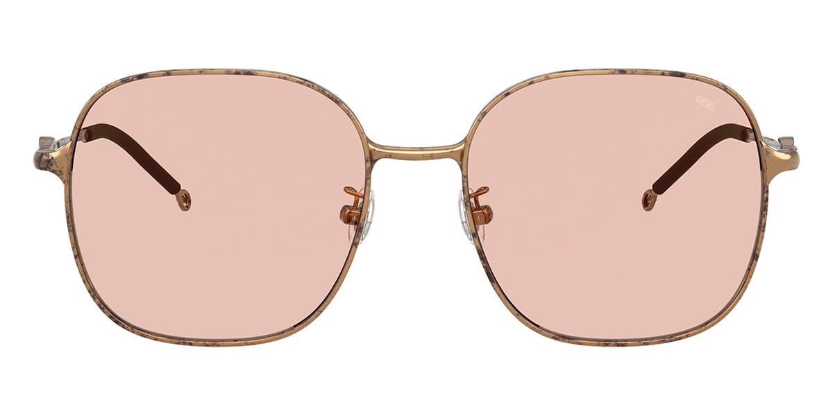 This square Diesel sunglass comes in a distressed bronze frame with pale rose lenses.