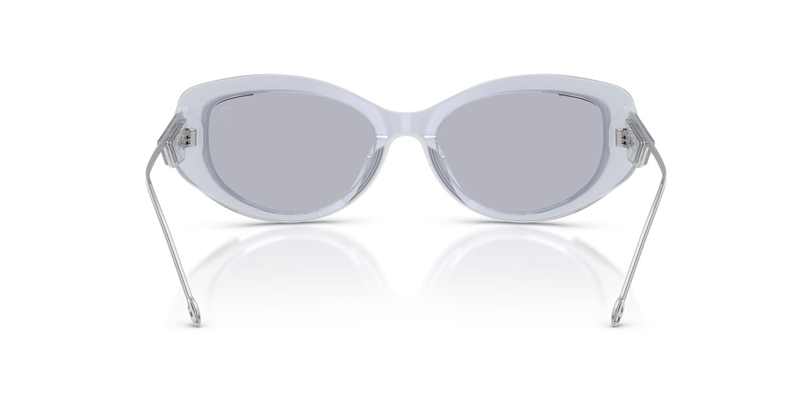 This round Diesel sunglass comes in a shiny iridescent crystal frame with violet lenses.