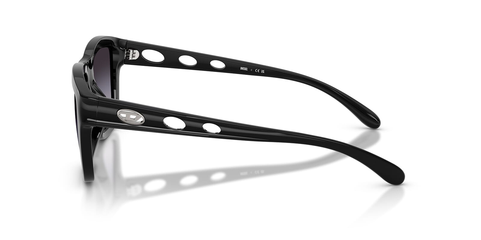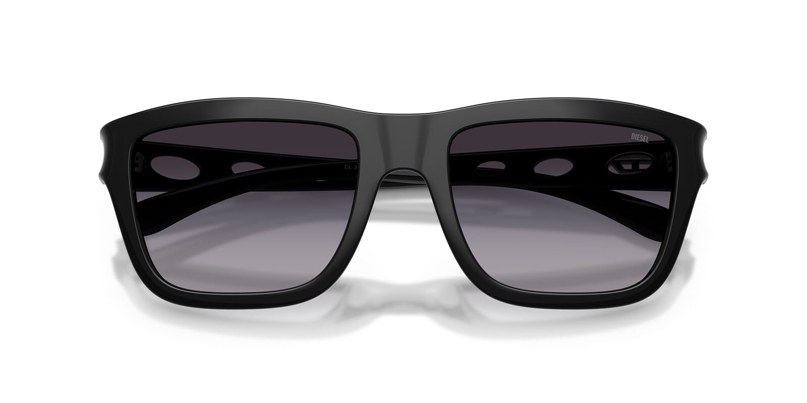 This square Diesel sunglass comes in a shiny black frame with grey gradient lenses.