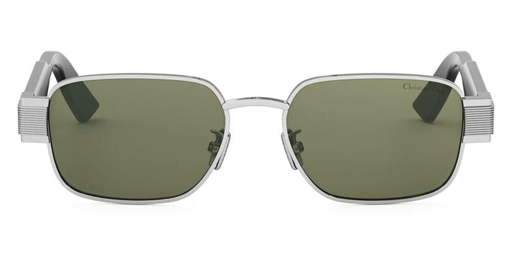 This square Dior sunglass comes in a shiny silver frame with green with light mirror lenses.