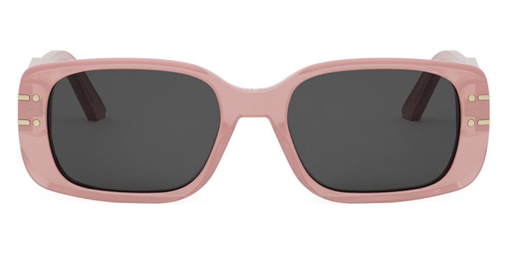 This square Dior sunglass comes in a shiny rose pink frame with grey lenses.